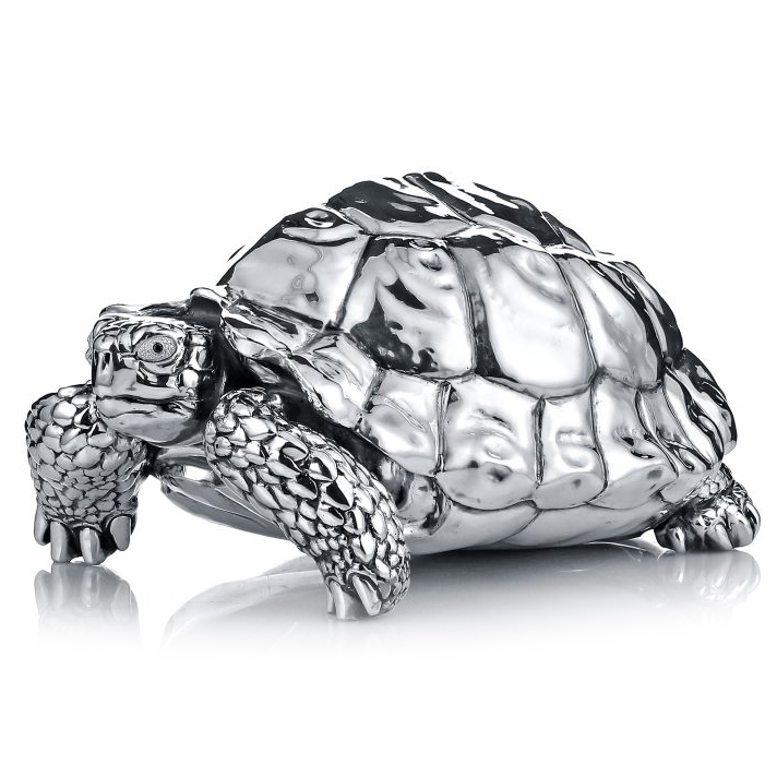 Скульптура «Черепаха» — декоративный объект, выполненный из серебра, воплощающий символ долголетия, мудрости и устойчивости. Благодаря гладкой, зеркальной поверхности панциря и рельефной проработке лап и головы фигура производит яркое впечатление и выглядит особенно эффектно при направленном освещении.