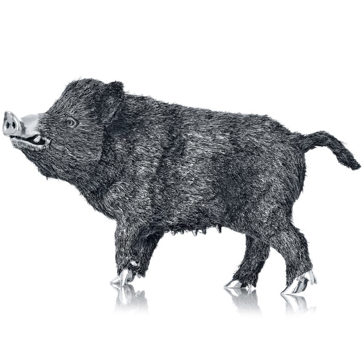 Фигурка выполнена вручную из серебра 925 пробы с вкраплениями бриллиантов общим весом 0,14 карата. Мастера ювелирного искусства использовали сложную технику «шерсти» и литья, позволяющую передать мельчайшие детали — от ворсистой щетины до мускулистого корпуса животного. Каждый изгиб его корпуса — это результат филигранной работы, передающей напряжение и движение дикого зверя.