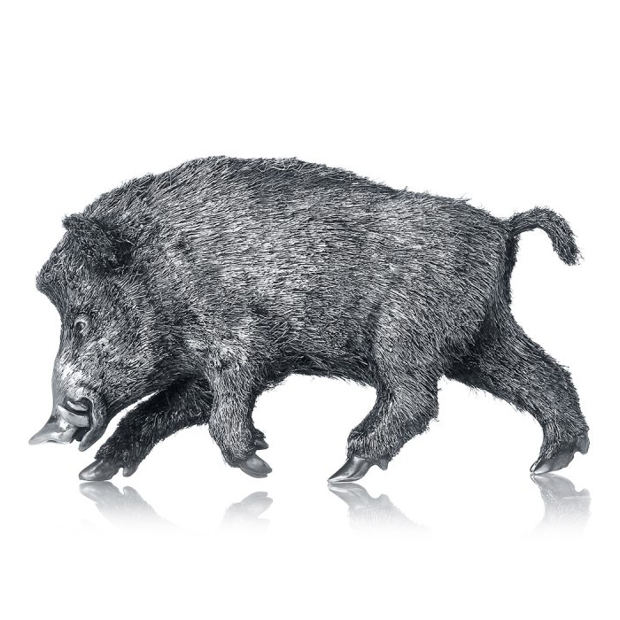 Глаза изделия инкрустированы бриллиантами общим весом 0,038 карата, что придаёт образу живость и характер. Кабан исполнен без подставки, благодаря чему может органично встроиться в любой интерьер — как акцент на рабочем столе, в библиотеке или коллекционном шкафу.