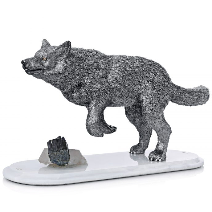 Поверхность фигуры тщательно проработана вручную в технике «шерсти»: каждое направление меха, изгиб тела и мельчайшие детали головы проработаны до фотографической точности. Отчётливо видны рельефные скулы, надбровные дуги, резкие линии морды. На глазах — бриллиантовые вставки, придающие взгляду хищницы живой блеск и холодную остроту. Всё тело волчицы выполнено из серебра 925 пробы, что подчёркивает её силу и грацию в благородном металлическом сиянии.