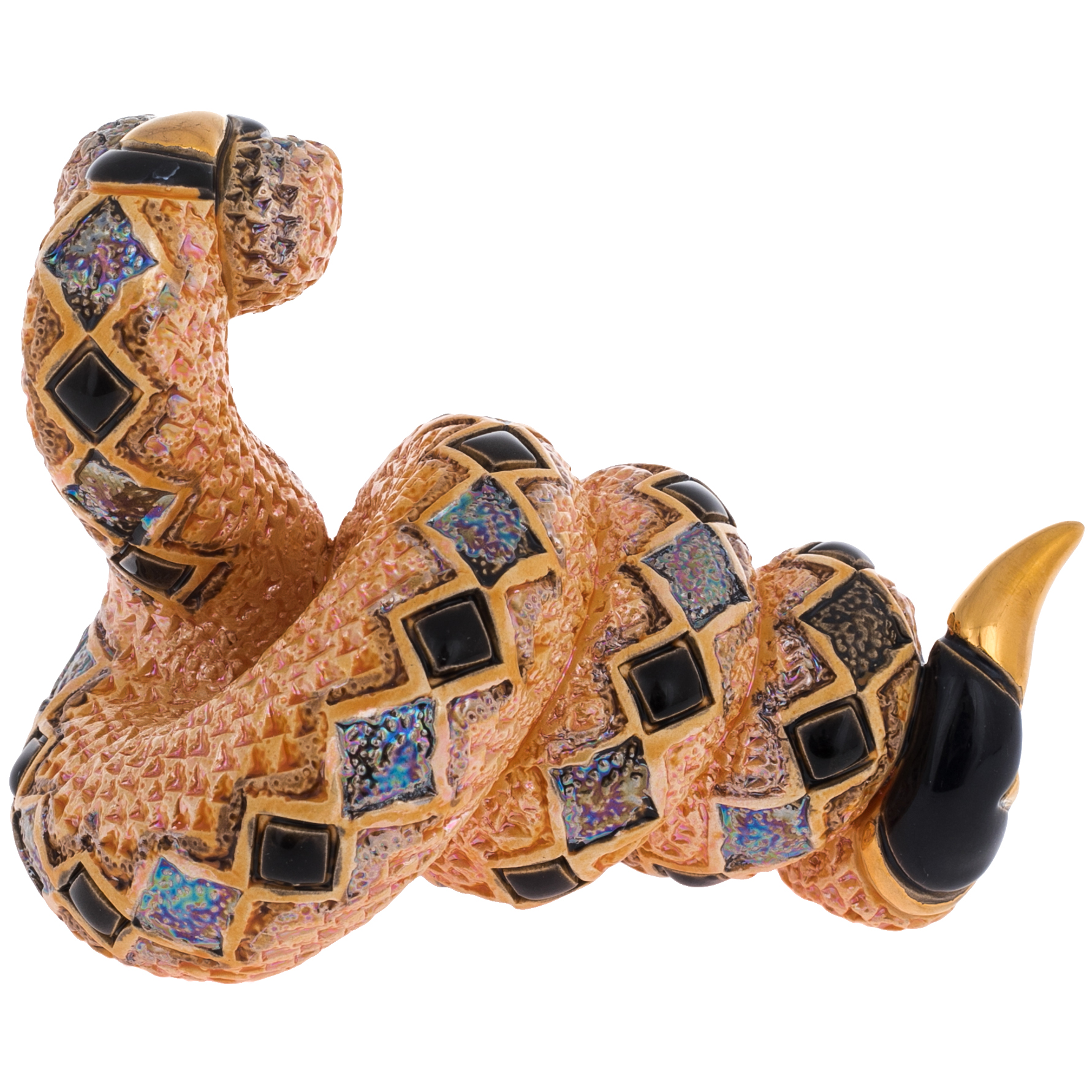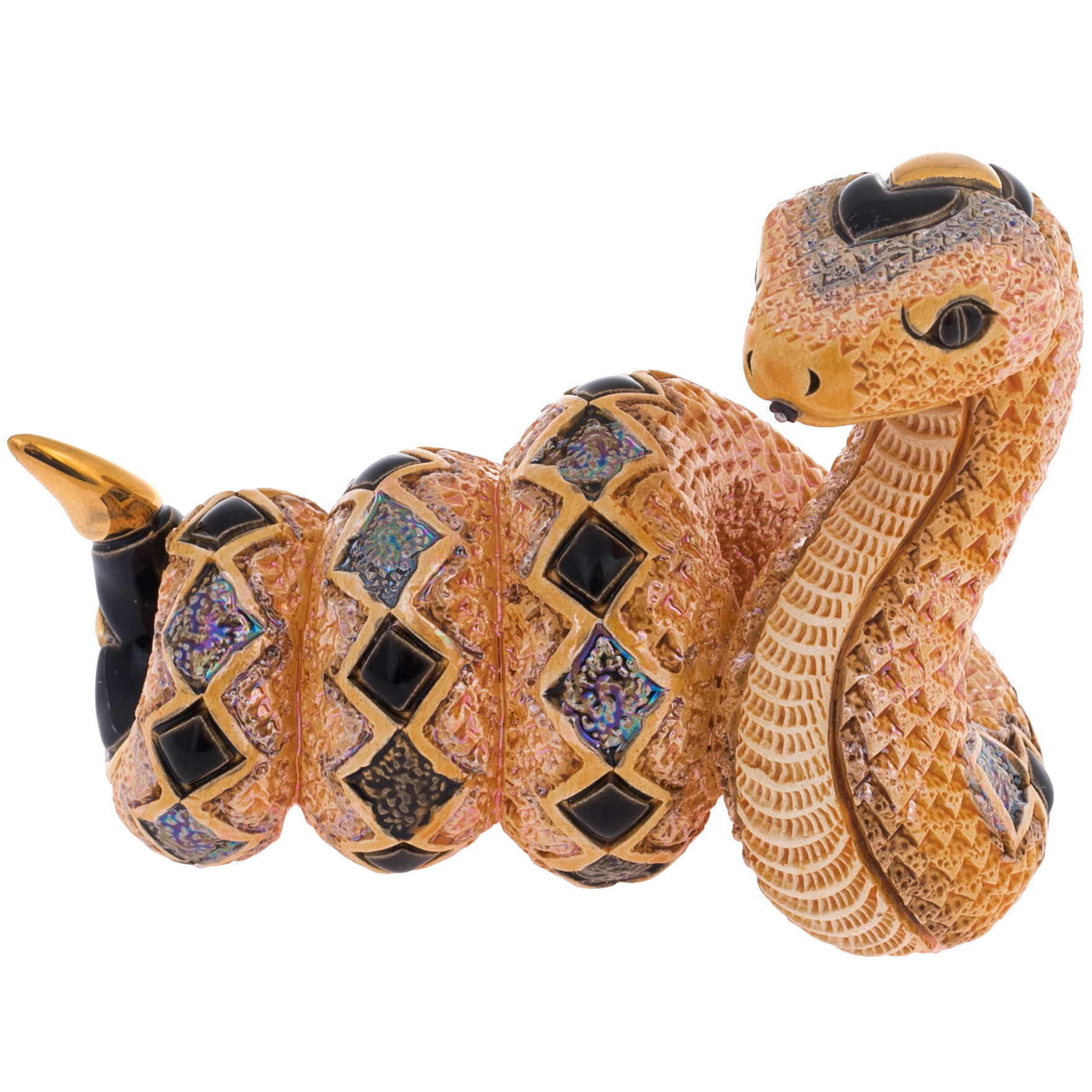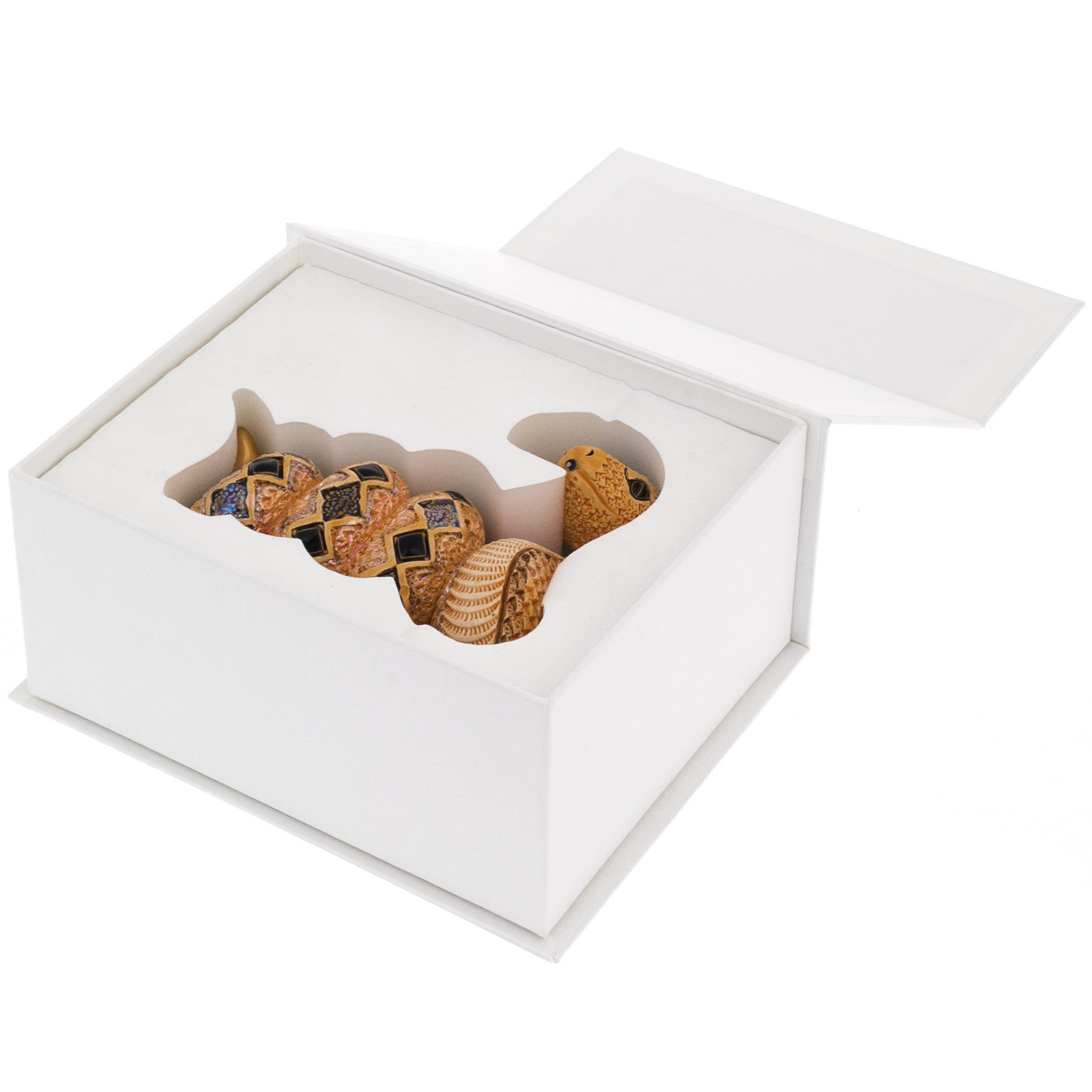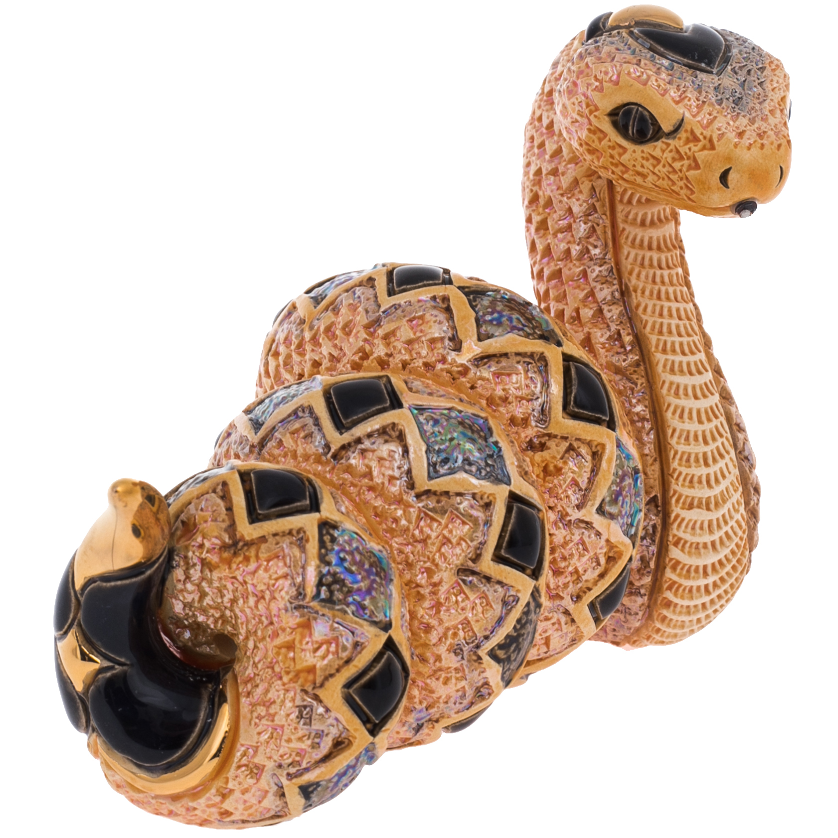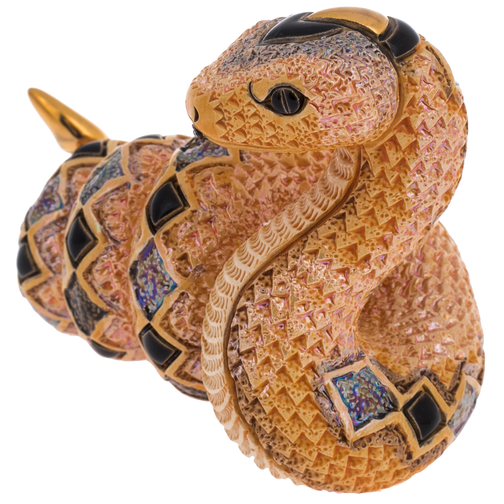 Каждая чешуйка, проработанная с ювелирной тщательностью, создаёт игру света, превращая статуэтку в произведение искусства. Блестящие вкрапления, как драгоценные камни, подчеркивают изысканность и придают змее величие. Грациозно изогнутая шея и слегка приподнятая голова придают образу змеи достоинство и загадочность, делая её идеальным символом мудрости и внутренней силы.