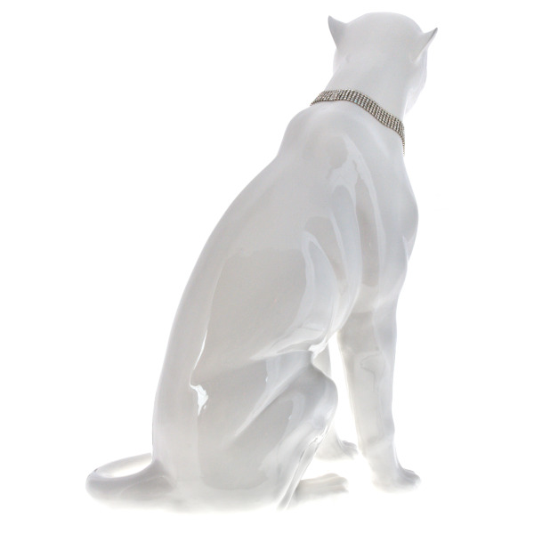 Украшением служит элегантный воротник, инкрустированный сверкающими камнями, расположенными в три ряда. Этот акцент — не просто деталь, а символический жест: дикая природа, заключённая в оболочку утончённого лоска, подчинена, но не укрощена. Глаза пантеры, выделенные контрастной эмалью, притягивают внимание с тем же магнетизмом, с каким настоящий хищник контролирует своё пространство. Эффект присутствия столь силён, что скульптура будто наполняет собой воздух, заставляя замедлить шаг и взглянуть снова. Поверхность статуэтки отполирована вручную, а роспись выполнена мастерами, специализирующимися на работе с чёрной эмалью.