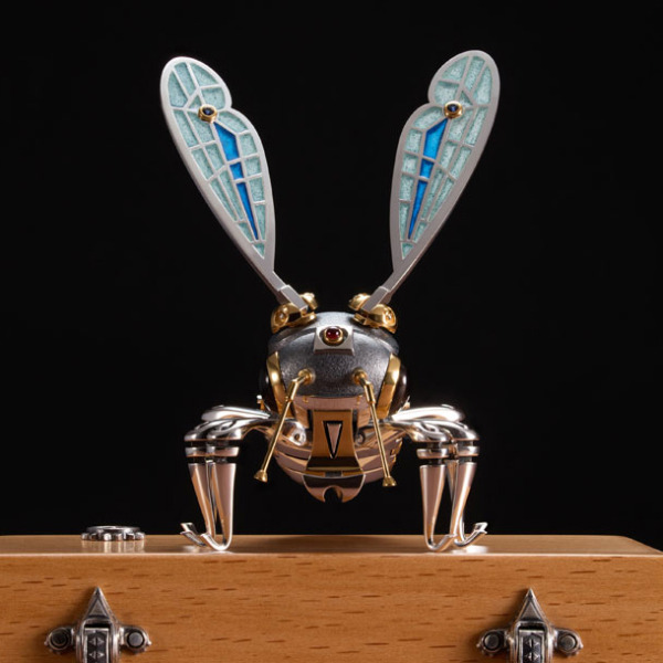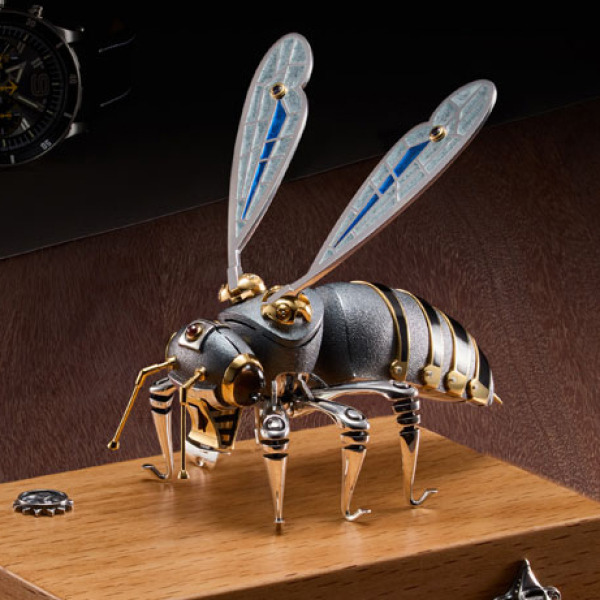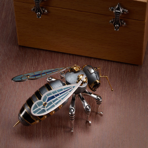 Украшение интерьера — ювелирный арт-объект «Пчела», выполненный с изумительной точностью и вниманием к мельчайшим деталям. Модель сочетает в себе техническую изощрённость и художественную выразительность: корпус состоит из серебристых и золотистых элементов, а крылья инкрустированы эмалью с витражным эффектом, имитирующим тонкие прожилки настоящих насекомых. Головка, лапки и крылья являются подвижными, благодаря чему изделие словно оживает при каждом прикосновении. Каждый изгиб и сочленение рассчитаны с инженерной точностью, что придаёт миниатюре правдоподобие и динамику.