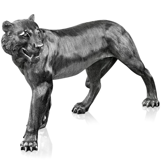 Словно вынырнув из джунглей Восточной Африки, этот серебряный тигр несёт в себе первозданную силу хищника и элегантность великого охотника. Фигура — часть коллекции «Сафари», вдохновлённой легендарными трофеями африканской охоты, олицетворяющими доблесть, ловкость и власть над дикой природой.