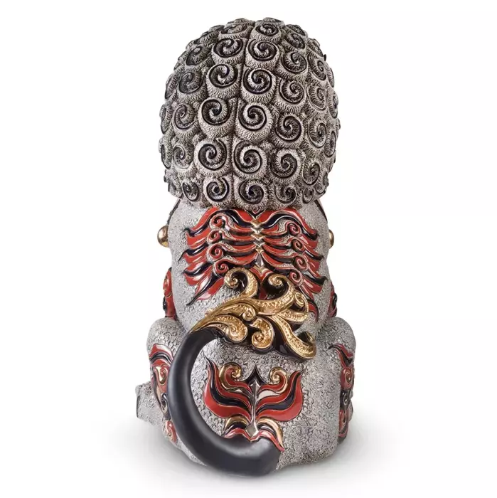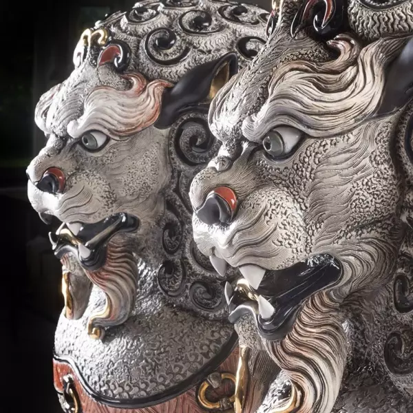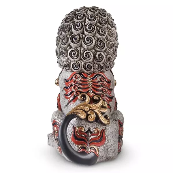 Поверхность скульптуры проработана с исключительной внимательностью: текстура шерсти передана через сложный рельеф, создающий живую игру света и тени, а грива, закрученная в декоративные спирали, добавляет образу динамику и глубину. Лаконичное сочетание светлого основного тона с контрастными акцентами в отделке подчёркивает пластическую выразительность формы, усиливая восприятие деталей — от напряжённых мышц лап до выразительных черт морды. Декоративный пояс с подвесными элементами, выполненный в тёплой металлической гамме, привносит в композицию нотку торжественности и завершённости, связывая воедино все элементы образа.