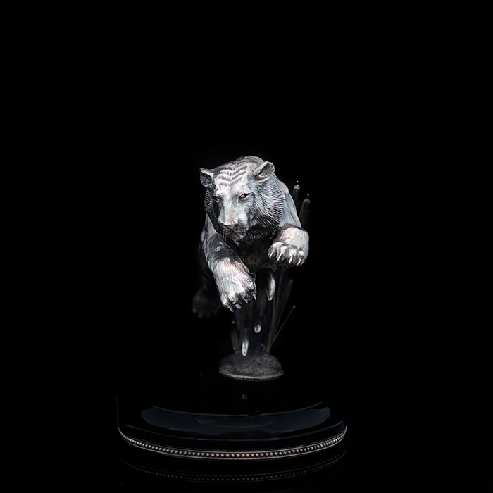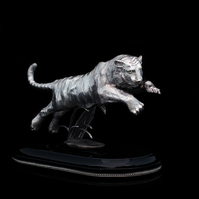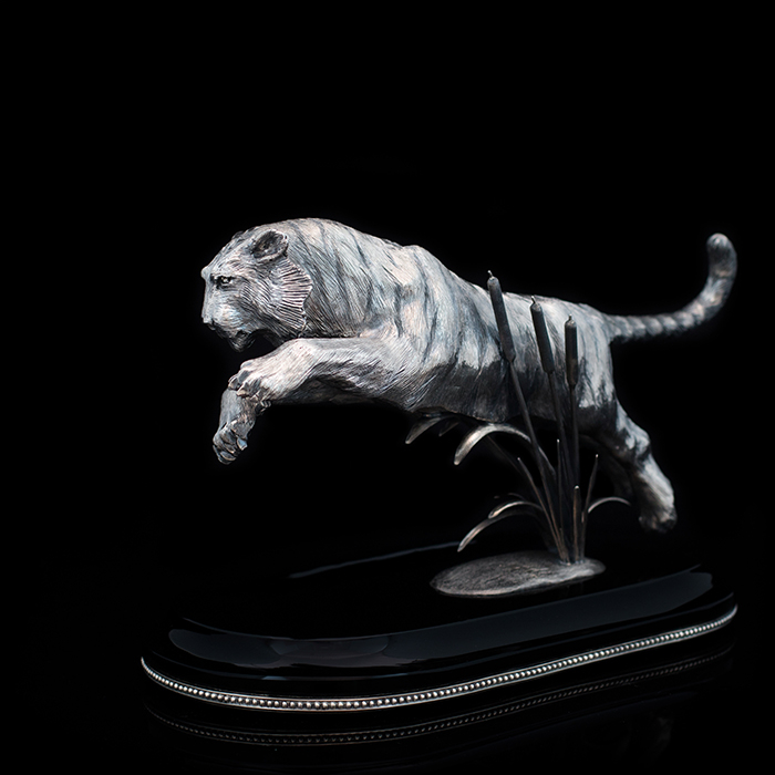 Скульптура «Тигр» выполнена из серебра 925 пробы в сочетании с камнем обсидиан. В подставке из обсидиана предусмотрено специальное место для размещения письменного инструмента.