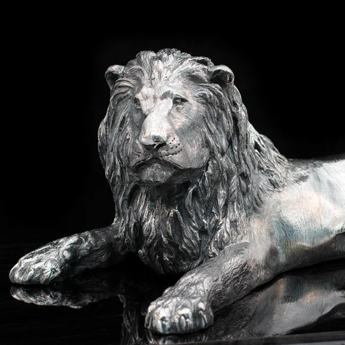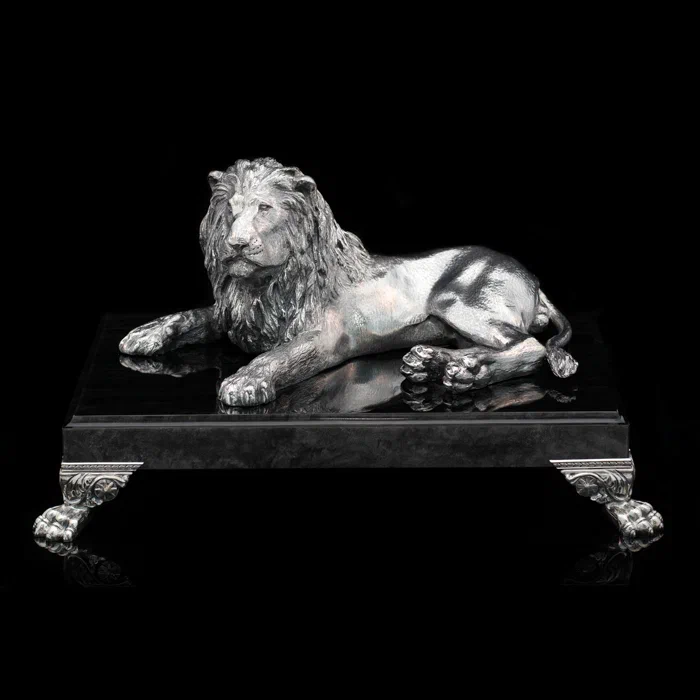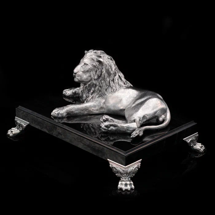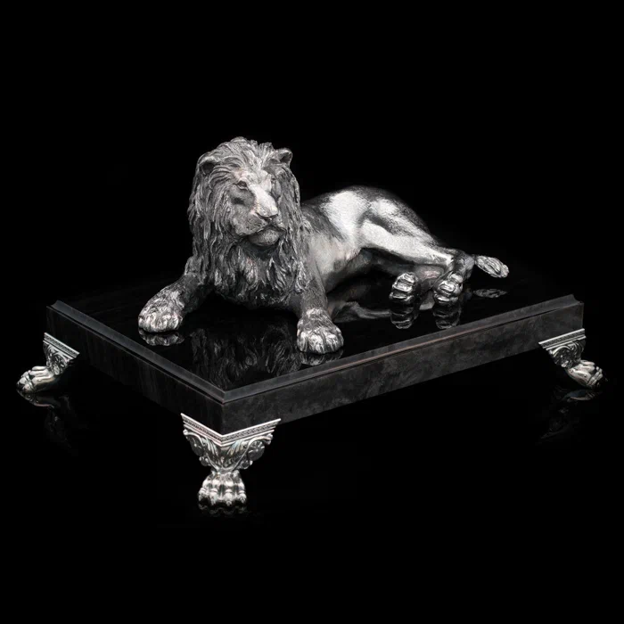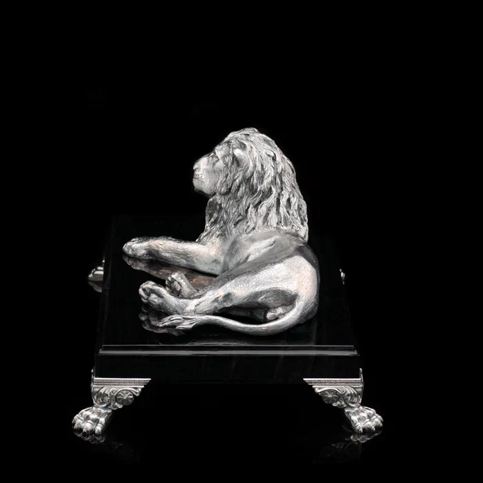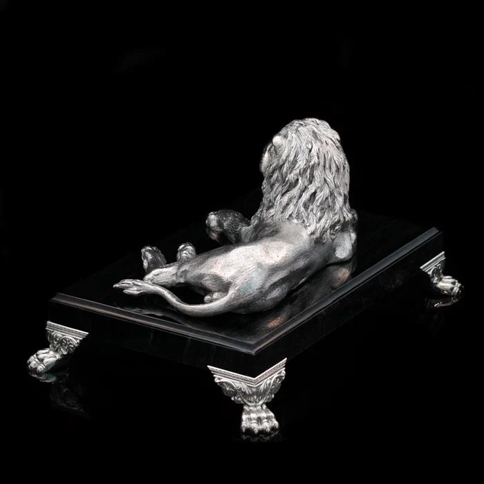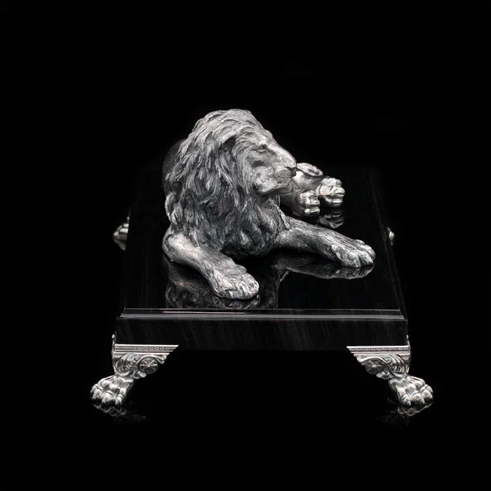 Изящная скульптура "Лев" выполнена из серебра 925 пробы в сочетании с массивнной подставкой из чёрного обсидиана.