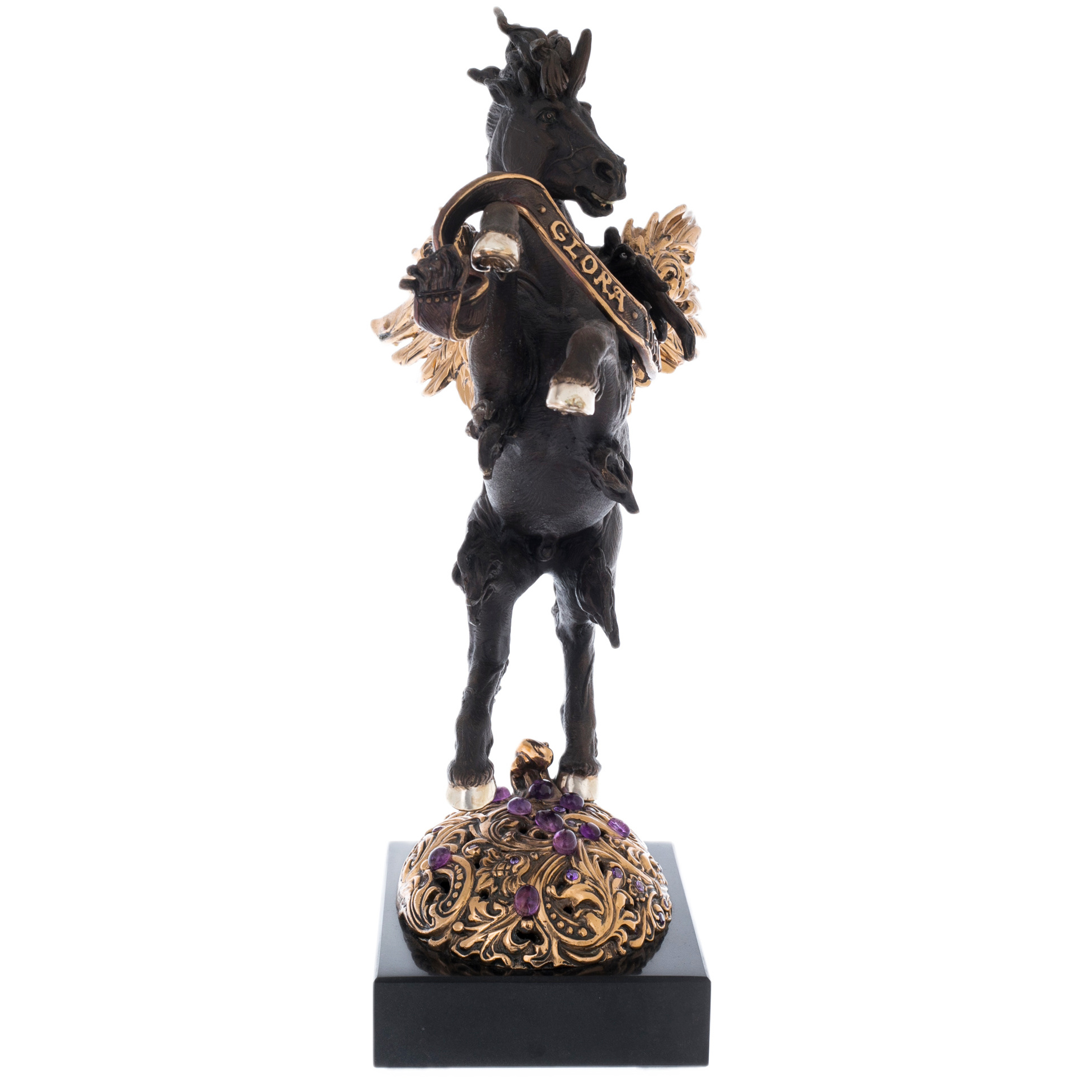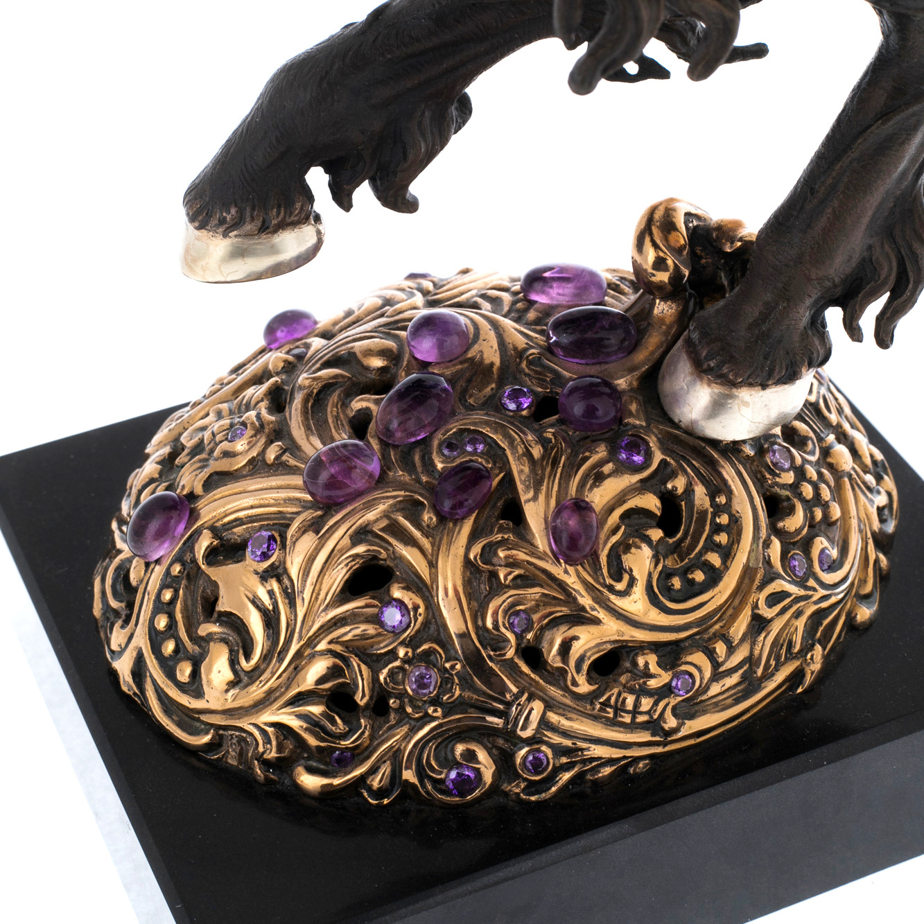Скульптура выполнена из бронзы с применением техники дорогостоящего вакуумного литья, что позволяет достичь исключительной точности и детализации. Поверхность композиции украшена тончайшими узорами, а инкрустация аметистами придает ей неповторимое сияние и богатство. Аметисты, рассыпанные по золотым лугам, символизируют величие и роскошь, подчеркивая исключительность этого произведения.