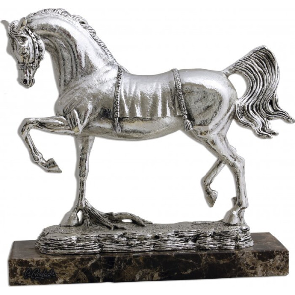 Стремительность, грация и чистая энергия движения воплощены в серебряном силуэте этого благородного коня. Его корпус изящно вытянут, копыта едва касаются земли, словно мгновение назад он сорвалсяь с привязи, свободный, дерзкий, непокоренный. Тонкая шея выгнута, взгляд устремлен вдаль — в нем живут дух восточных ветров и наследие древних племен, испокон веков ценивших этих стремительных скакунов как символ власти и силы.