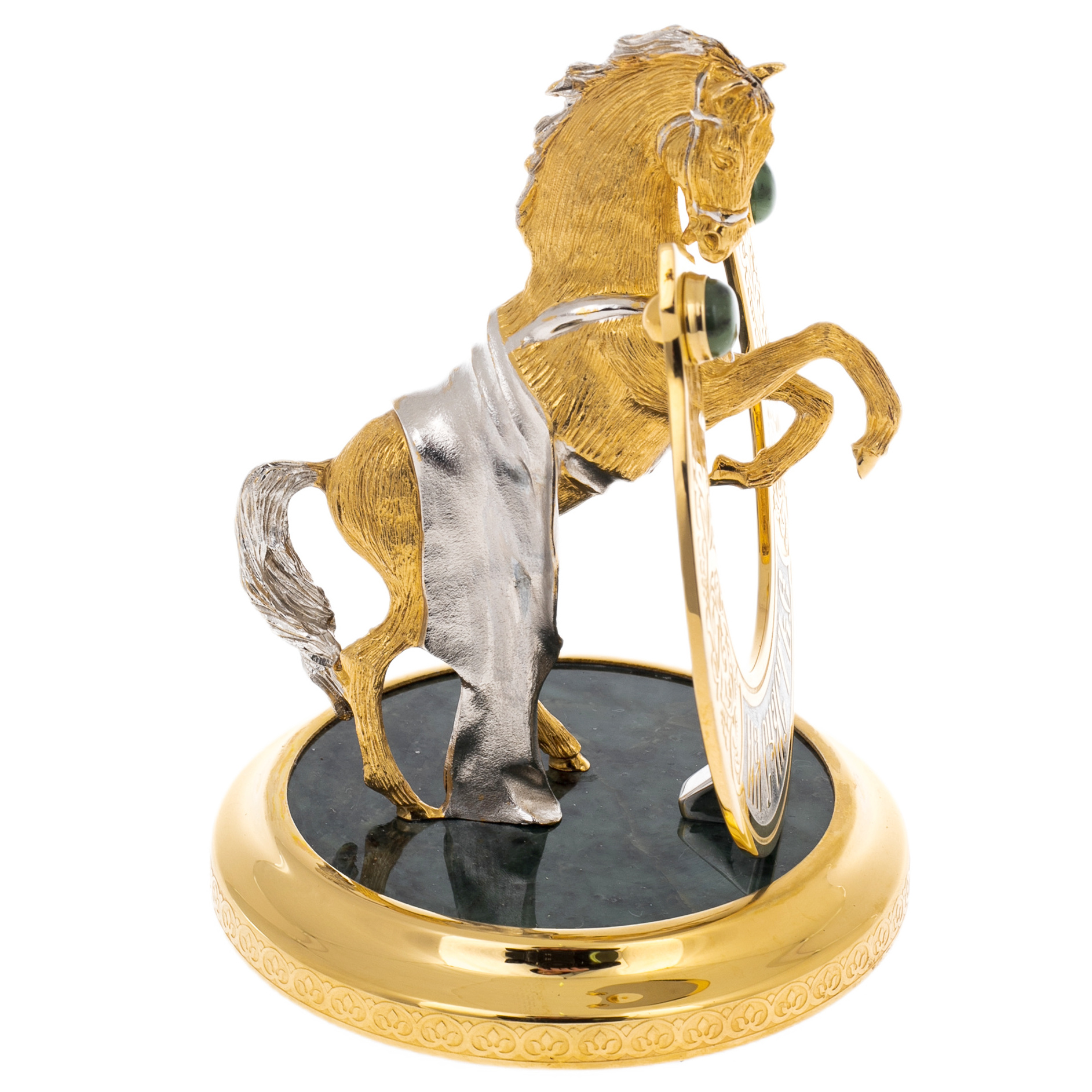 Змеевик, из которого изготовлена подставка статуэтки, имеет уникальную текстуру и насыщенный зеленый цвет. Этот камень, также известный как серпентинит, отличается высокой прочностью и долговечностью. Он широко используется в декоративных и ювелирных изделиях благодаря своей способности долго сохранять первоначальный вид и устойчивости ко внешним воздействиям.