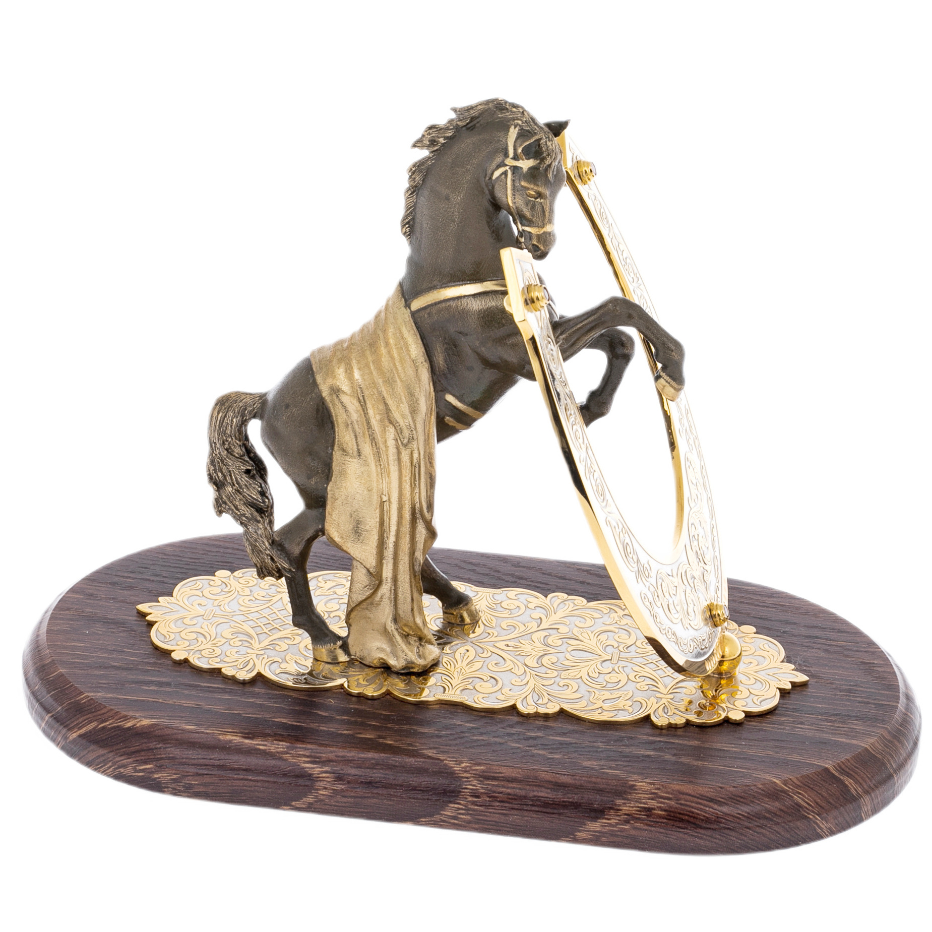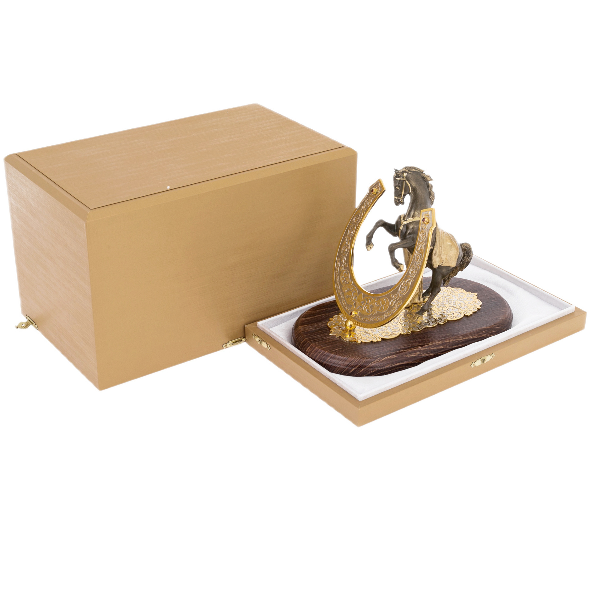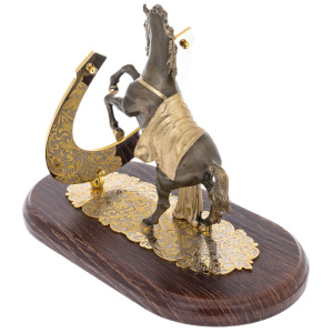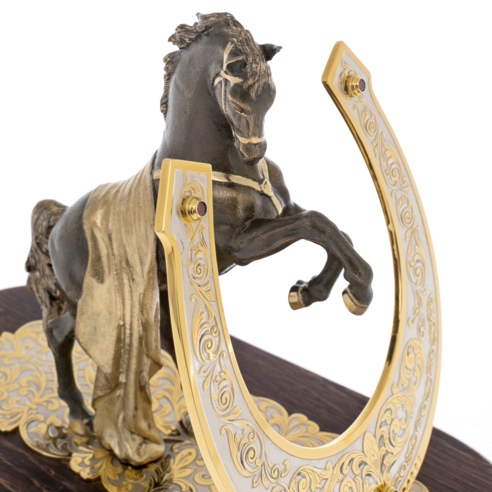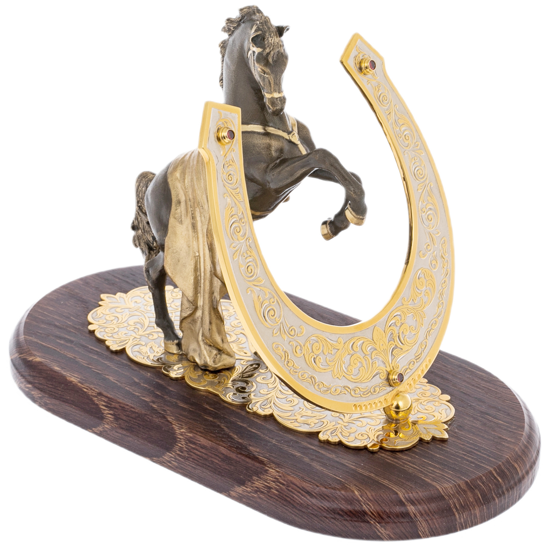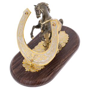 Смысл предмета лежит на поверхности и одновременно глубже: конь выражает власть над обстоятельствами, внутреннюю дисциплину и стремление к победе, подкова несёт символ удачи, защиты и верного пути. Деревянная подставка добавляет образу особую “кабинетную” культуру — вещь органично смотрится на рабочем столе, в переговорной, в библиотеке, рядом с коллекционными изданиями и предметами искусства. Такой подарок уместен для руководителя, владельца бизнеса, партнёра, умеющего ценить знаки внимания, выраженные не словами, а уровнем исполнения и точностью символов.