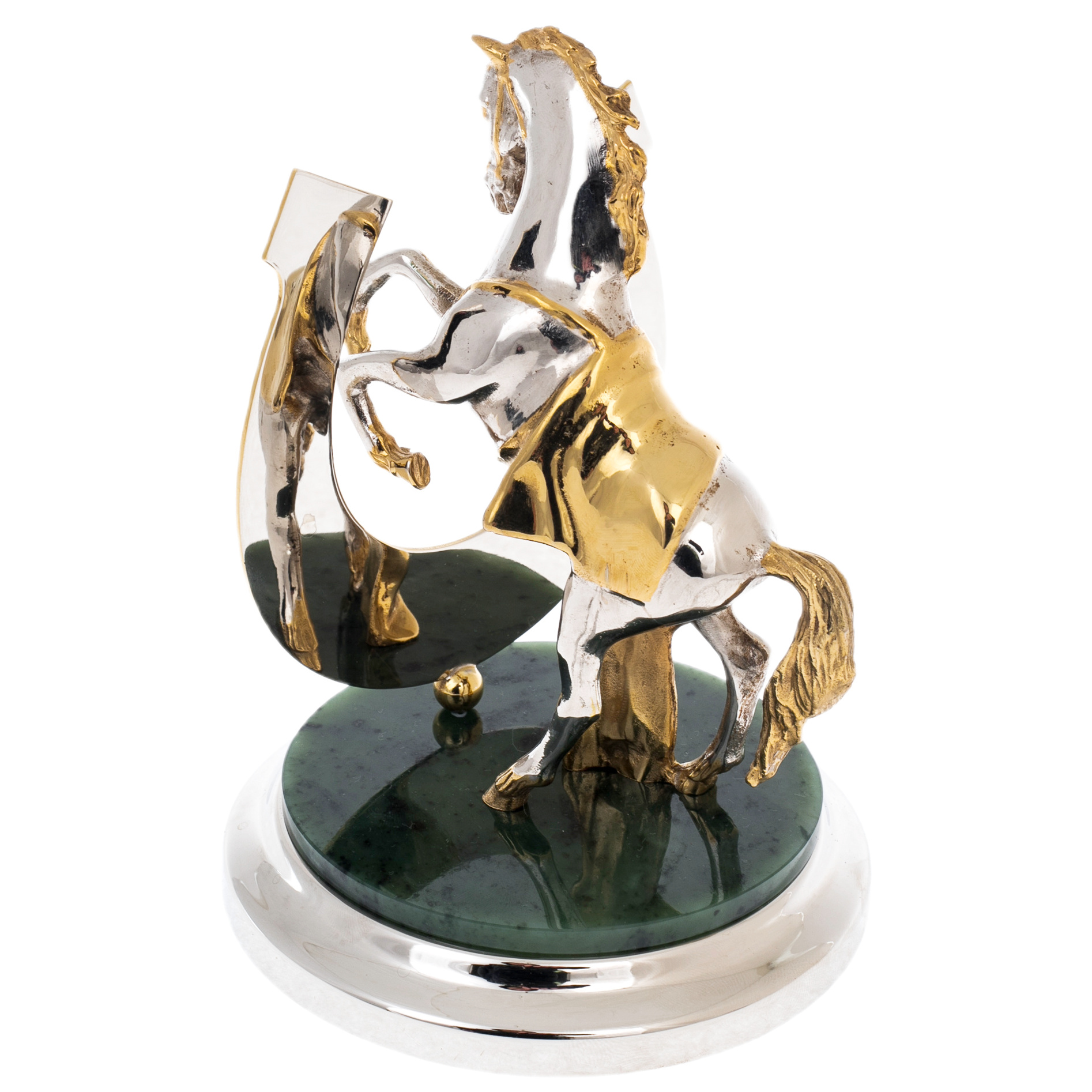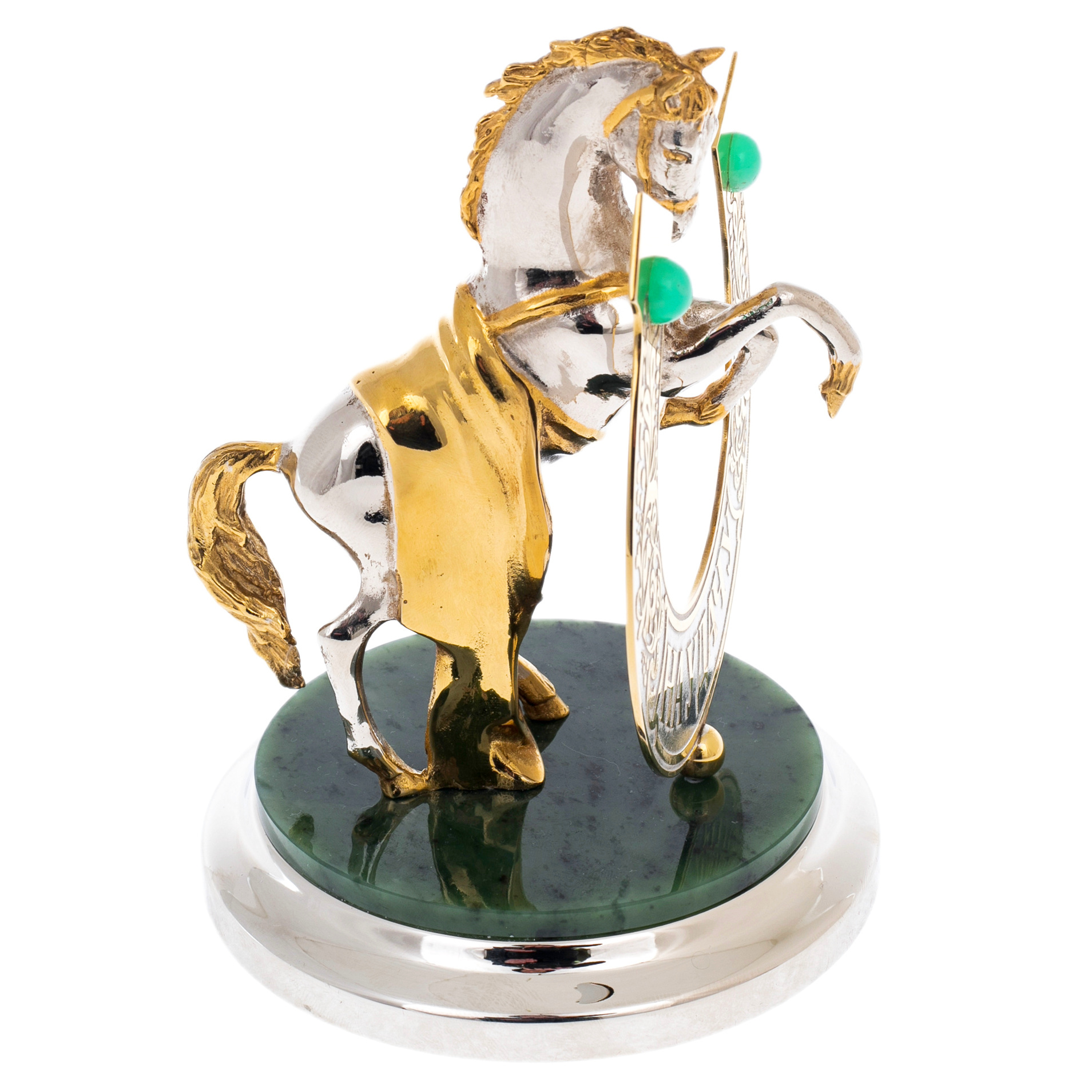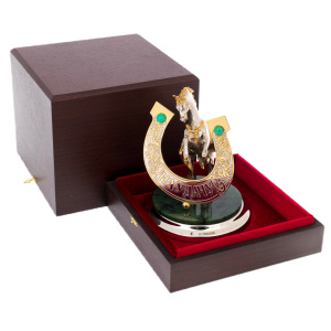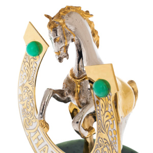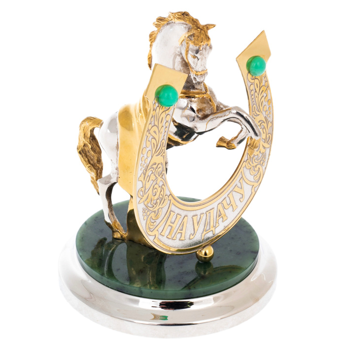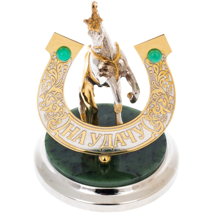 Статуэтка «Лошадь удачи» на подставке из нефрита, Златоуст — изящный символ движения вперёд и благосклонности судьбы, воплощённый в благородных металлах и редком камне. Фигура вздыбленного коня, исполненная в сочетании золота и никеля, передаёт энергию, уверенность и внутренний порыв к победе. На переднем плане — подкова с надписью «На удачу», украшенная резьбой и зелёными вставками, гармонирующими с глубоким цветом нефрита, из которого выполнена подставка. Каждый элемент композиции тщательно проработан: от гривы и мускулов животного до плавных линий орнамента, создающих ощущение силы, заключённой в утончённой форме.