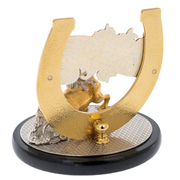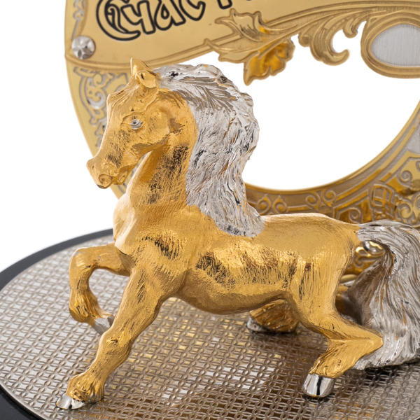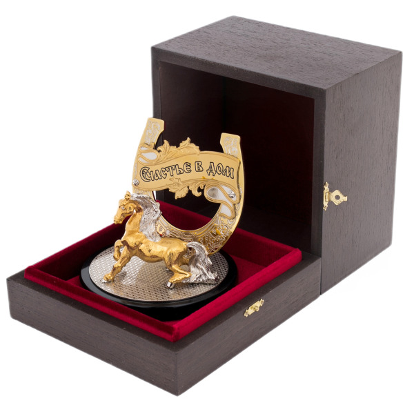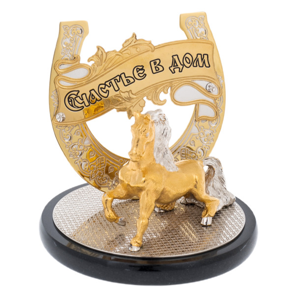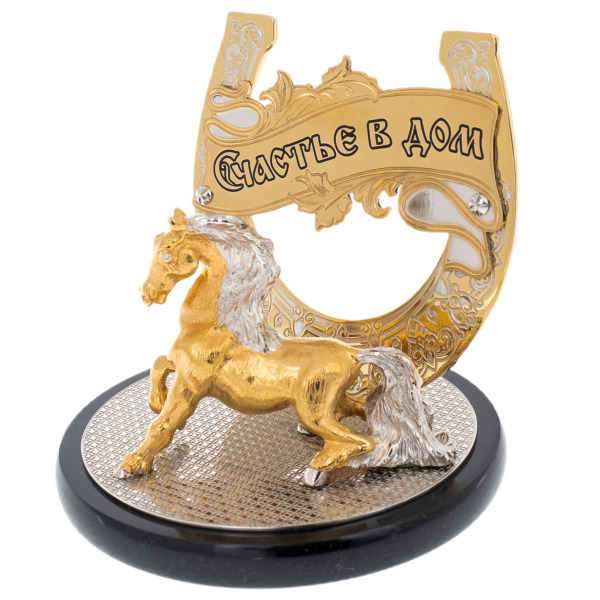 На черном основании из долерита размещена композиция: благородный конь, отлитый из латуни и покрытый позолотой и никелем, устремлён вперёд, словно готовый к скачку навстречу успеху. За его спиной — сияющая подкова с надписью «Счастье в дом», символ вечной защиты и благополучия.