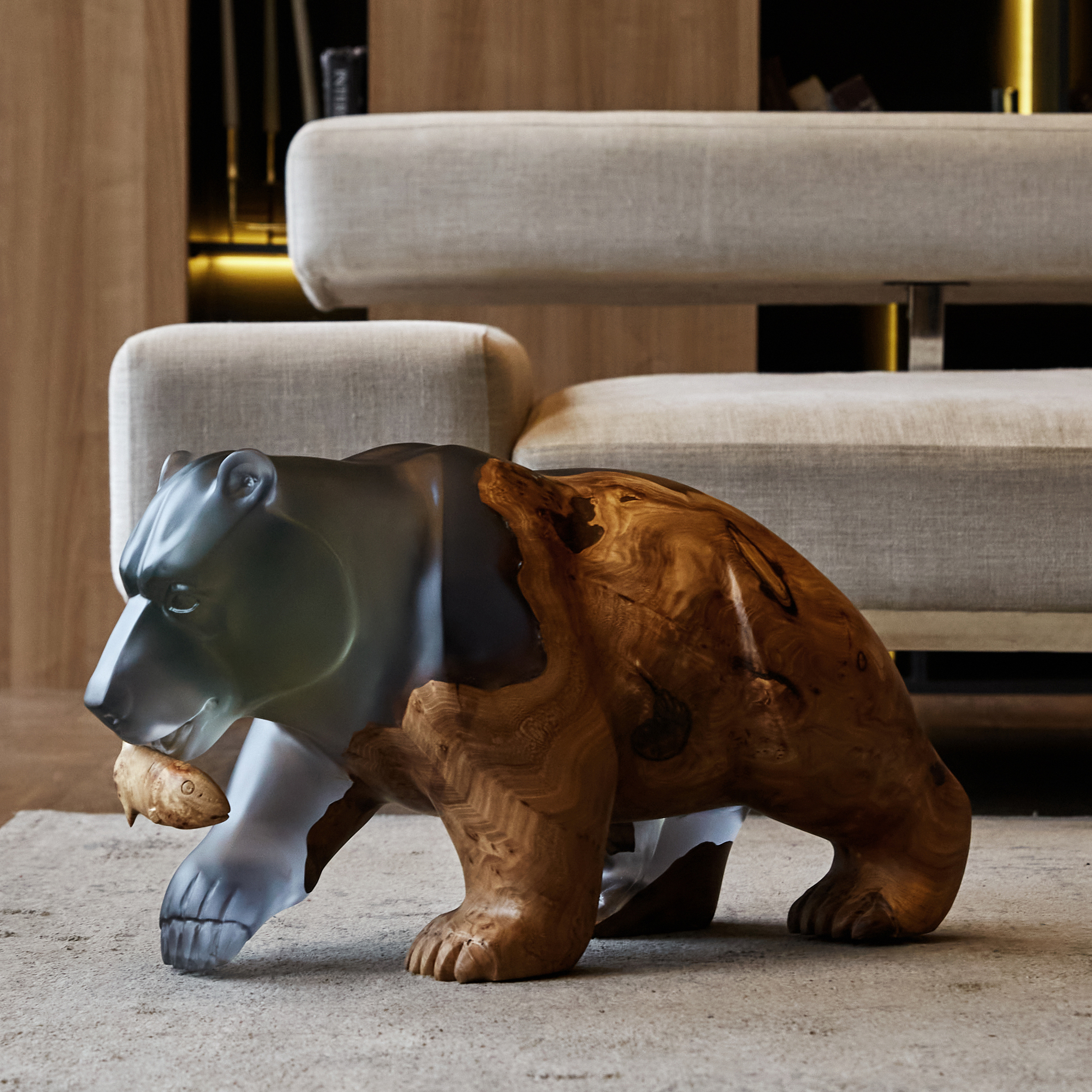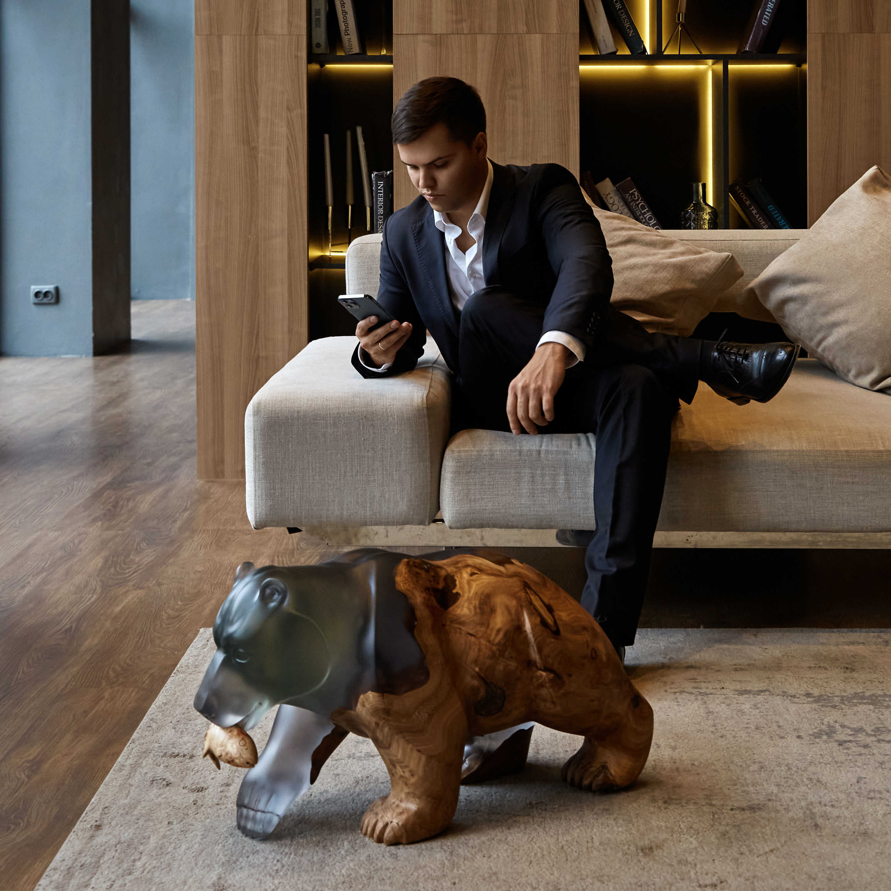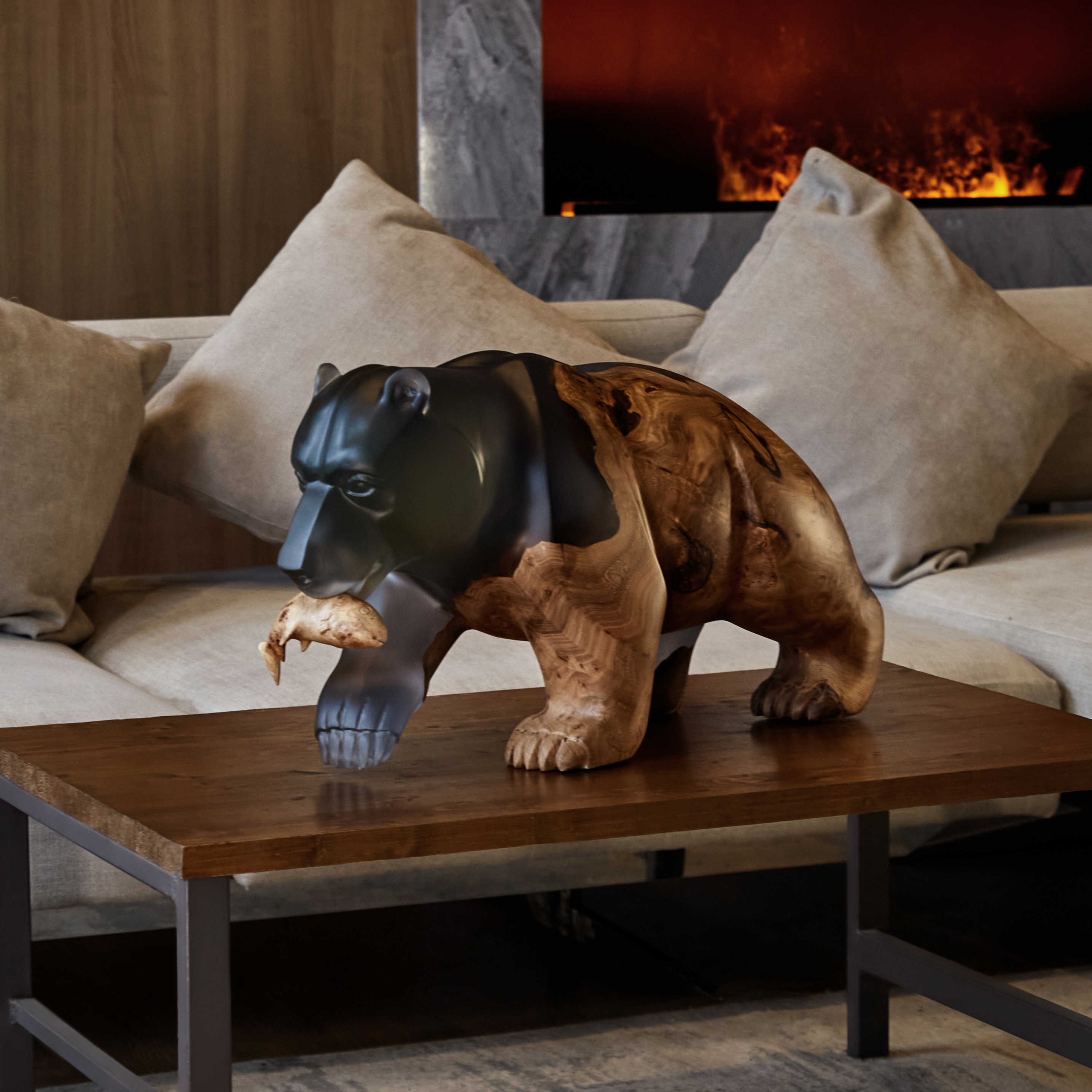 Этот арт-объект предназначен для интерьеров с характером: кабинет, каминная комната, современное арт-пространство — там, где властвует вкус и не терпятся компромиссы. Медведь из ореха и смолы — не просто элемент декора, а эмоционально заряженный центр притяжения, отражающий характер хозяина: сильного, сосредоточенного, внутренне цельного.