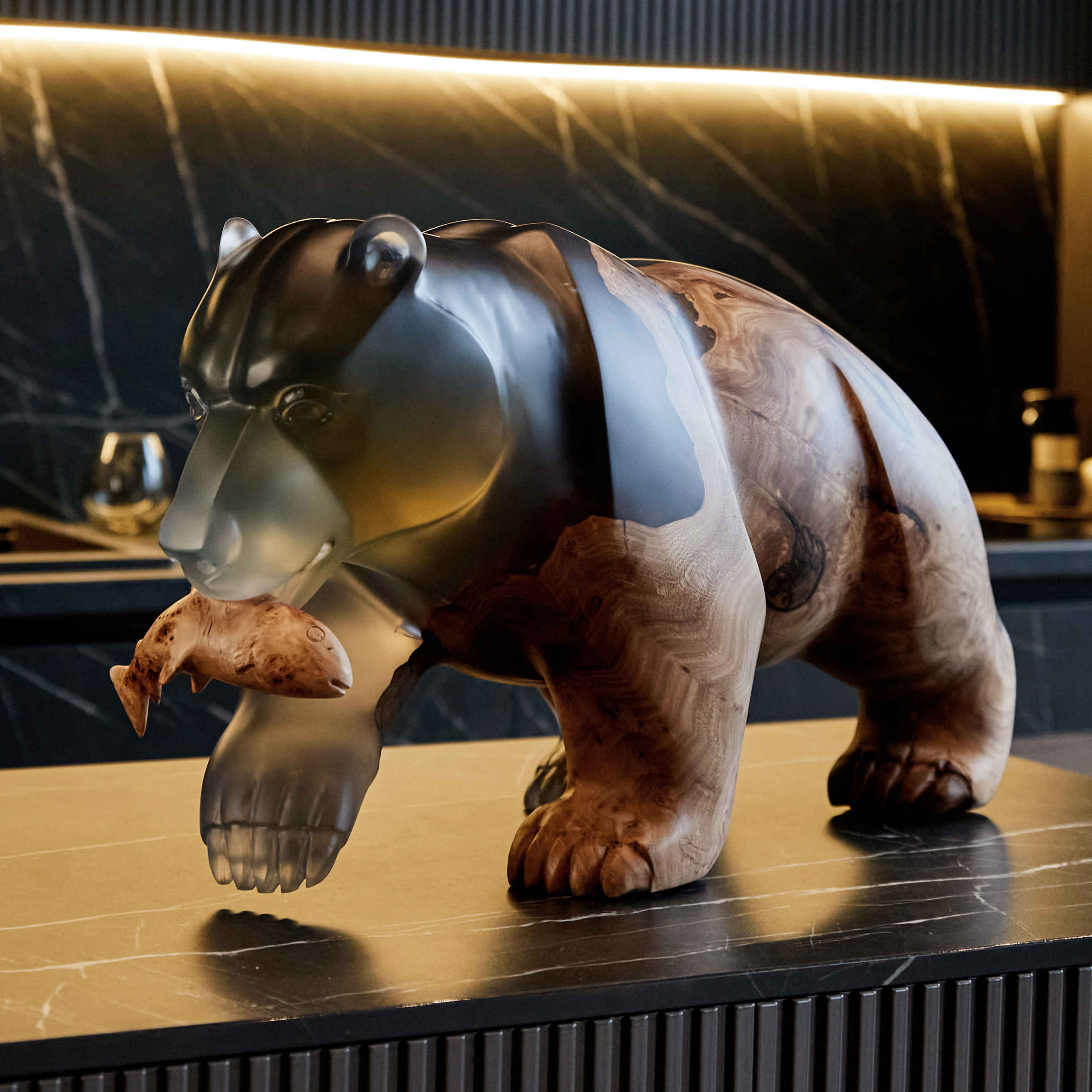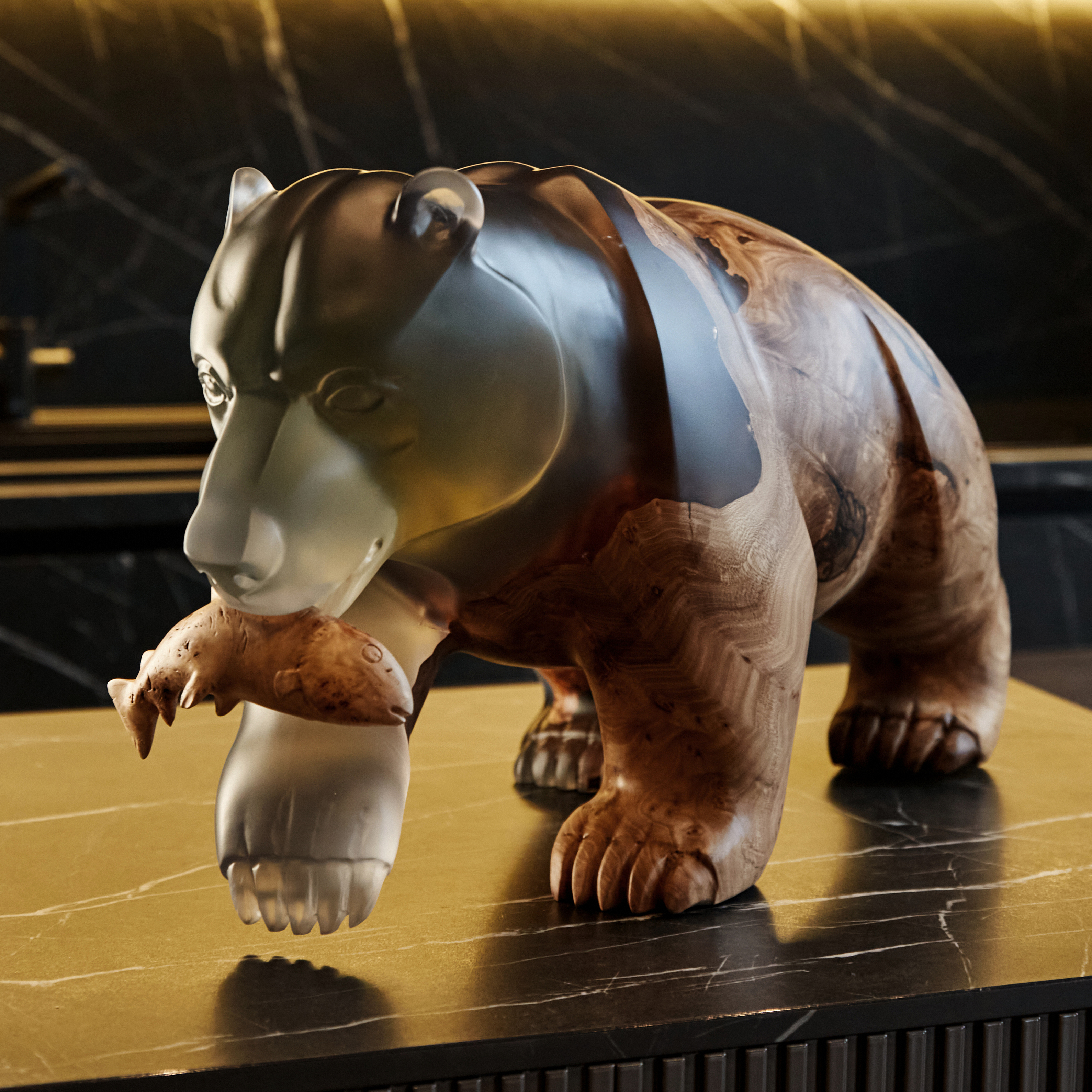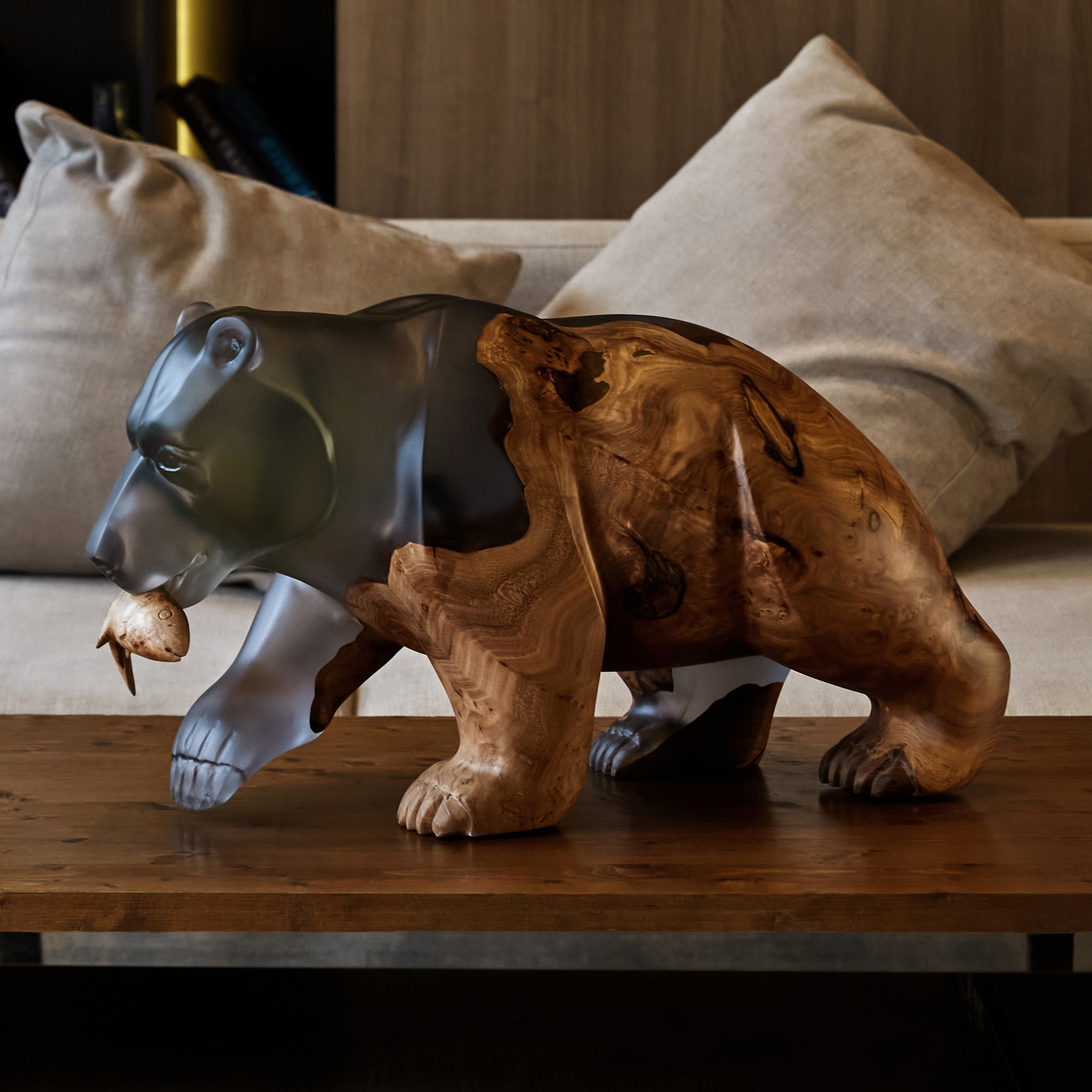 Скульптура «Медведь», выполненная из массива американского ореха и эпоксидной смолы, — выразительный символ силы, природной мощи и первозданной грации. В теле зверя слились два элемента: тёплая, живая структура дерева с богатой игрой фактуры и плотная, почти дымчатая смола, создающая эффект ледяной глубины. Этот контраст подчёркивает внутреннее напряжение образа: зверь, будто выныривая из тумана, несёт в пасти рыбу — завершённую деревянную миниатюру, выточенную с филигранной точностью.