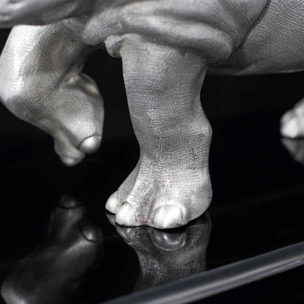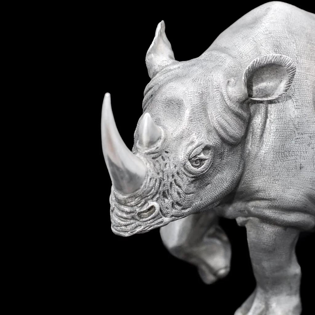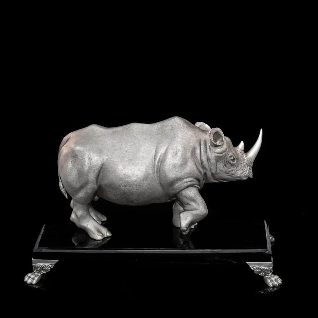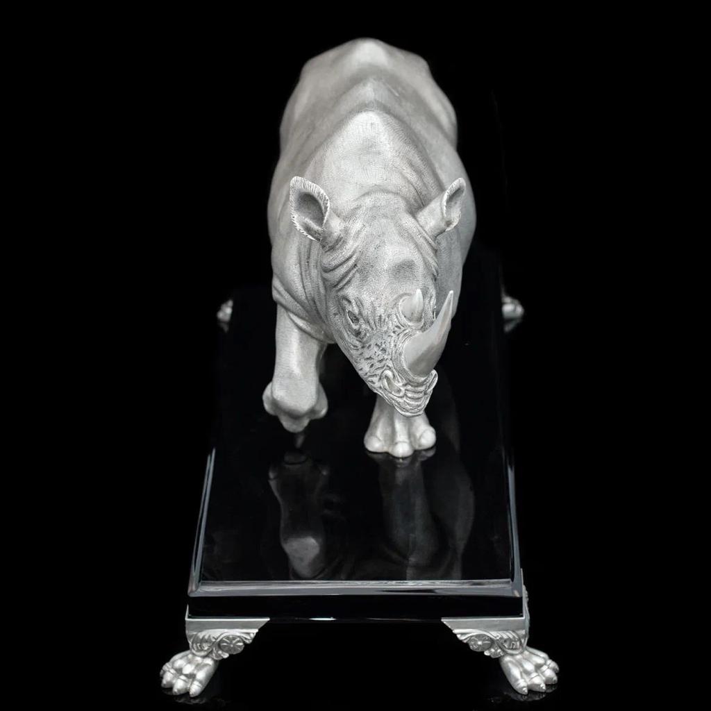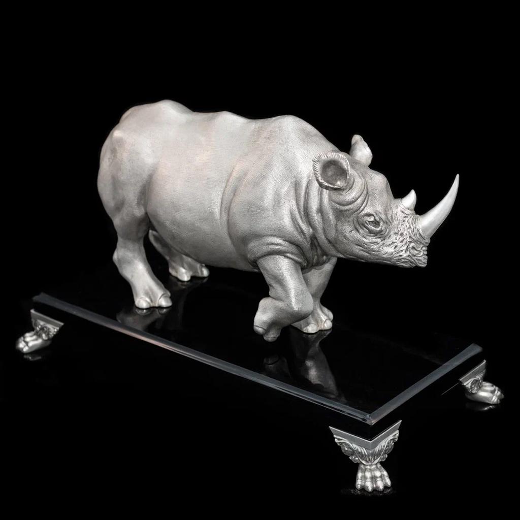 Массивная фигура носорога, выполненная из серебра, воплощает неукротимую силу, несгибаемую волю и природную мощь. Каждая деталь тщательно проработана, позволяя ощутить текстуру его кожи, изгиб могучих рогов и напряжение в движении. Отлитая в металле динамика шага придает скульптуре ощущение реальности, создавая эффект присутствия животного, готового прорваться сквозь время. Подставка из черного стекла с серебряными лапами придает композиции дополнительный вес и элегантность, подчеркивая монументальность образа.