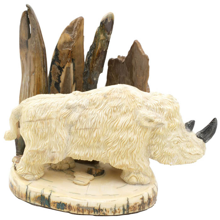 Редкий по выразительности и масштабу коллекционный объект — шерстистый носорог, выполненный из бивня мамонта, с настоящими рогами из черного рога и размещённый на круглом основании, обрамлённом вертикальными фрагментами древнего материала. Скульптура передаёт монументальность и невозмутимую силу доисторического зверя: шерсть воспроизведена в мельчайших деталях, движения лап вылеплены с лёгкой пружинистостью, взгляд наполнен сосредоточенной настороженностью. Тело животного замерло в шаге, а за его спиной поднимаются срезы реликтового бивня — словно застывшие стены скального ландшафта, подчеркивающие мощь силуэта.