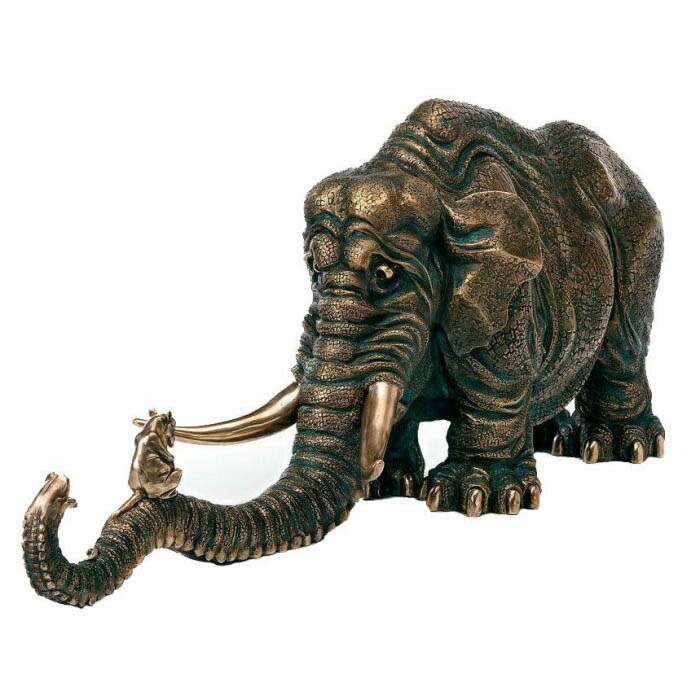 Изготовленная из бронзы, скульптура отражает высочайшее мастерство художественного литья, превращая металл в живую историю. Техника английского чернения добавляет глубину и загадочность, подчеркивая каждую деталь текстуры. Кожа слона, словно покрытая узорами времени, передает его древнюю мудрость и непоколебимую стойкость, а гладкость его бивней создает эффект благородной силы. Хобот, изогнувшийся в плавной дуге, тянется к мыши с трогательной осторожностью, будто она способна одним своим присутствием укротить гиганта.