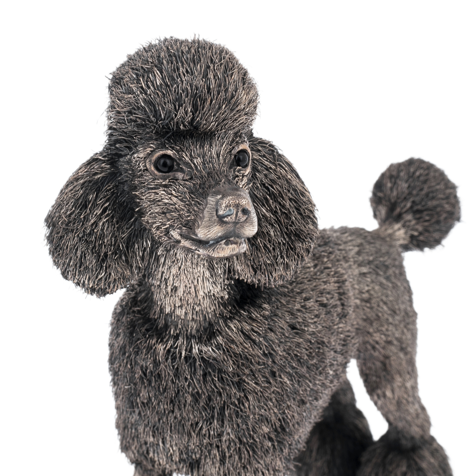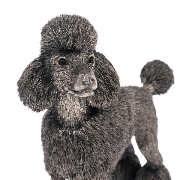 Этот серебряный пудель – воплощение грации, преданности и благородного происхождения. Как изысканный символ аристократического вкуса, он застыл в вечности, передавая черты одной из самых элегантных пород в мире. Его силуэт излучает уверенность и достоинство, а филигранно проработанная фактура шерсти создаёт иллюзию живого движения, будто пёс только что сделал шаг и замер в ожидании команды.