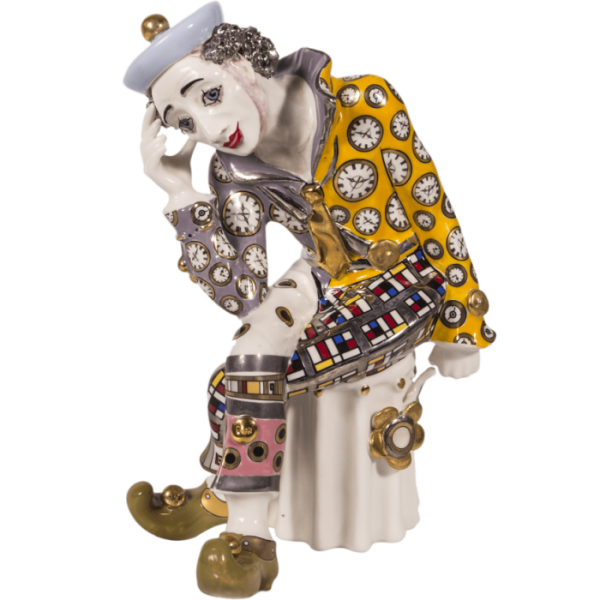 Изготовленная вручную из керамики, расписанная мастерами с филигранной точностью, статуэтка излучает очарование эпохи, в которой клоун был не только шутом, но и философом в гриме. Мягкий блеск глазури подчёркивает складки ткани и выражение лица, а выверенная поза делает фигуру живой, почти анимированной. Высота и вытянутость силуэта придают образу скульптурную значимость, подчёркивая его не как карикатуру, а как образ, достойный внимания и размышления.