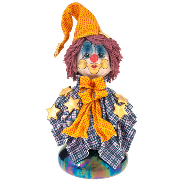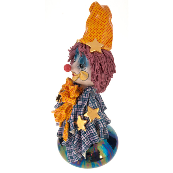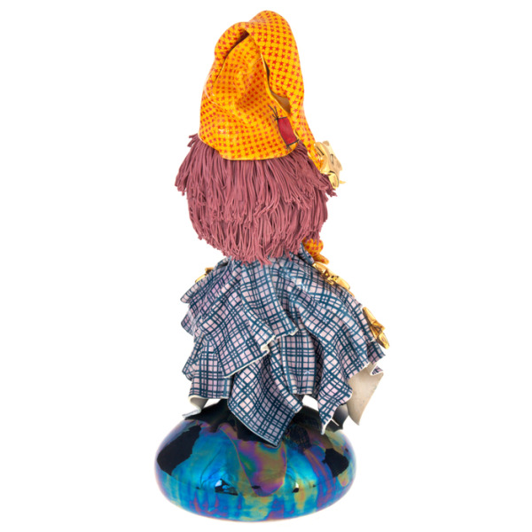 Каждая деталь клоуна проработана с любовью и вниманием к нюансам. Яркий пиджак с крупными чёрно-белыми пуговицами, свободные штаны с мелким рисунком, пышный клетчатый воротник, озорная шляпа с цветком — всё это создаёт образ, балансирующий между карикатурой и теплотой. Особое внимание привлекает лицо: с застенчивой улыбкой, выразительными глазами и щёчками, раскрашенными так, будто клоун только что отыграл на празднике. Основание украшено случайными предметами — бантиками, пуговицами, деталями реквизита — словно на полу артистической гримёрки после шоу.