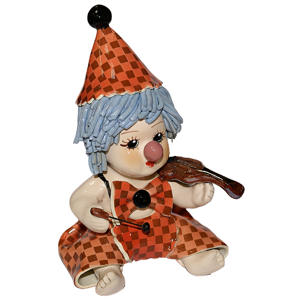 ZampivaСтатуэтка "Клоун, стоящий со скрипкой"Статуэтка "Клоун, стоящий со скрипкой"Эта статуэтка клоуна с скрипкой — не просто предмет декора, а фрагмент театра, воплощённый в фарфоре и краске, наполненный тонкой иронией и щемящей поэзией. Перед нами персонаж, замерший в моменте звучащей тишины: красный нос, немного грустные глаза, неловко сжатые плечи и скрипка, прижатая к подбородку, словно последнее утешение. Его костюм — нарочито эклектичный, с шахматными узорами, жёлтыми оборками, чёрно-белыми пуговицами и пёстрыми туфлями — создаёт образ циркового музыканта, неотделимого от сцены, но живущего в собственном мире. У подножия разбросаны листы партитур, ноты, старые игрушки — детали, превращающие фигуру в законченную историю.