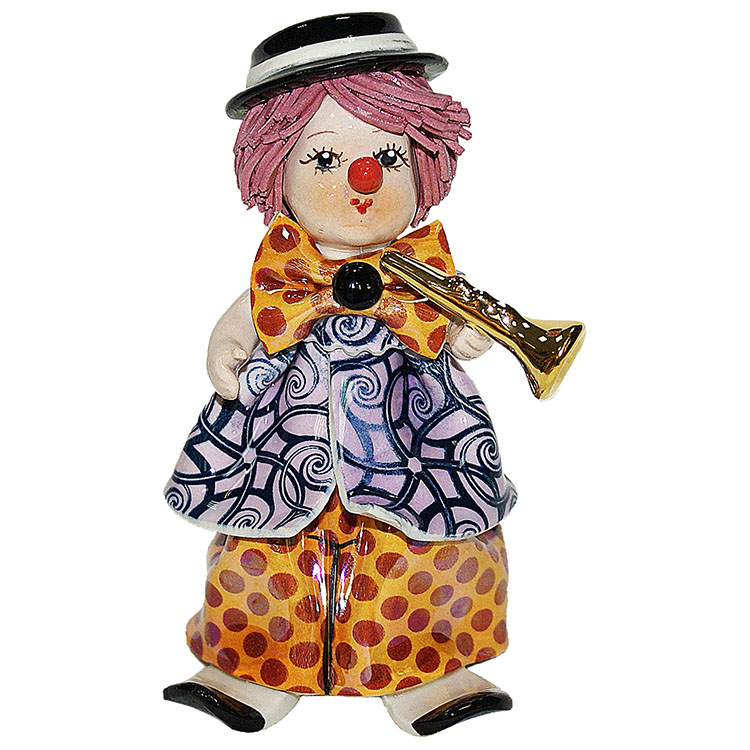 ZampivaСкульптура "Клоун с саксофоном"Скульптура "Клоун с саксофоном"Скульптура «Клоун с саксофоном» — это яркое и тёплое воплощение детской радости, сцены уличного театра и джазового вдохновения в керамике. Перед нами не просто декоративный персонаж, а образ с характером и собственной историей. Забавный и обаятельный клоун, облачённый в нарочито пёстрое, но при этом тщательно проработанное одеяние, кажется, только что вышел на сцену, чтобы подарить зрителям своё маленькое музыкальное представление. В руках — золотистый саксофон, блеск которого подчёркивает его центральную роль в композиции: инструмент звучит даже в молчании, оживляя персонажа.