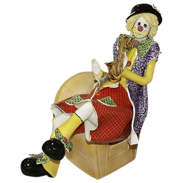 Скульптура "Клоун с саксофоном"Скульптура "Клоун с саксофоном"Скульптура «Клоун с саксофоном» — это яркое и тёплое воплощение детской радости, сцены уличного театра и джазового вдохновения в керамике. Перед нами не просто декоративный персонаж, а образ с характером и собственной историей. Забавный и обаятельный клоун, облачённый в нарочито пёстрое, но при этом тщательно проработанное одеяние, кажется, только что вышел на сцену, чтобы подарить зрителям своё маленькое музыкальное представление. В руках — золотистый саксофон, блеск которого подчёркивает его центральную роль в композиции: инструмент звучит даже в молчании, оживляя персонажа.