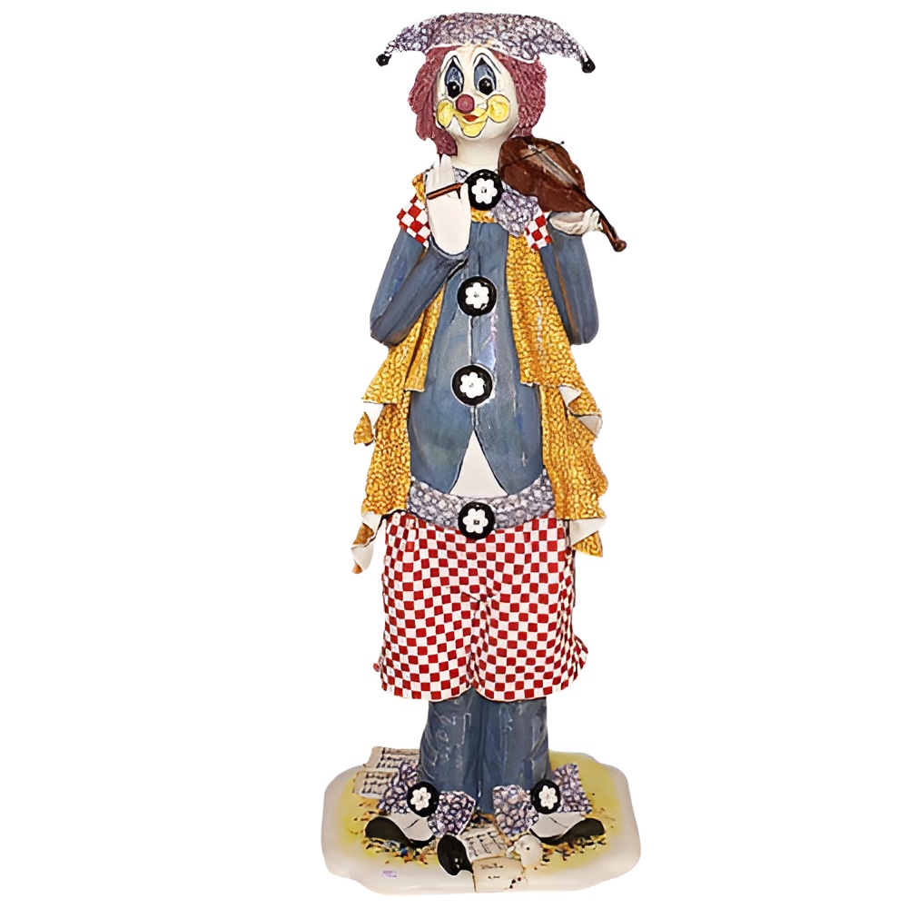 Эта статуэтка клоуна с скрипкой — не просто предмет декора, а фрагмент театра, воплощённый в фарфоре и краске, наполненный тонкой иронией и щемящей поэзией. Перед нами персонаж, замерший в моменте звучащей тишины: красный нос, немного грустные глаза, неловко сжатые плечи и скрипка, прижатая к подбородку, словно последнее утешение. Его костюм — нарочито эклектичный, с шахматными узорами, жёлтыми оборками, чёрно-белыми пуговицами и пёстрыми туфлями — создаёт образ циркового музыканта, неотделимого от сцены, но живущего в собственном мире. У подножия разбросаны листы партитур, ноты, старые игрушки — детали, превращающие фигуру в законченную историю.