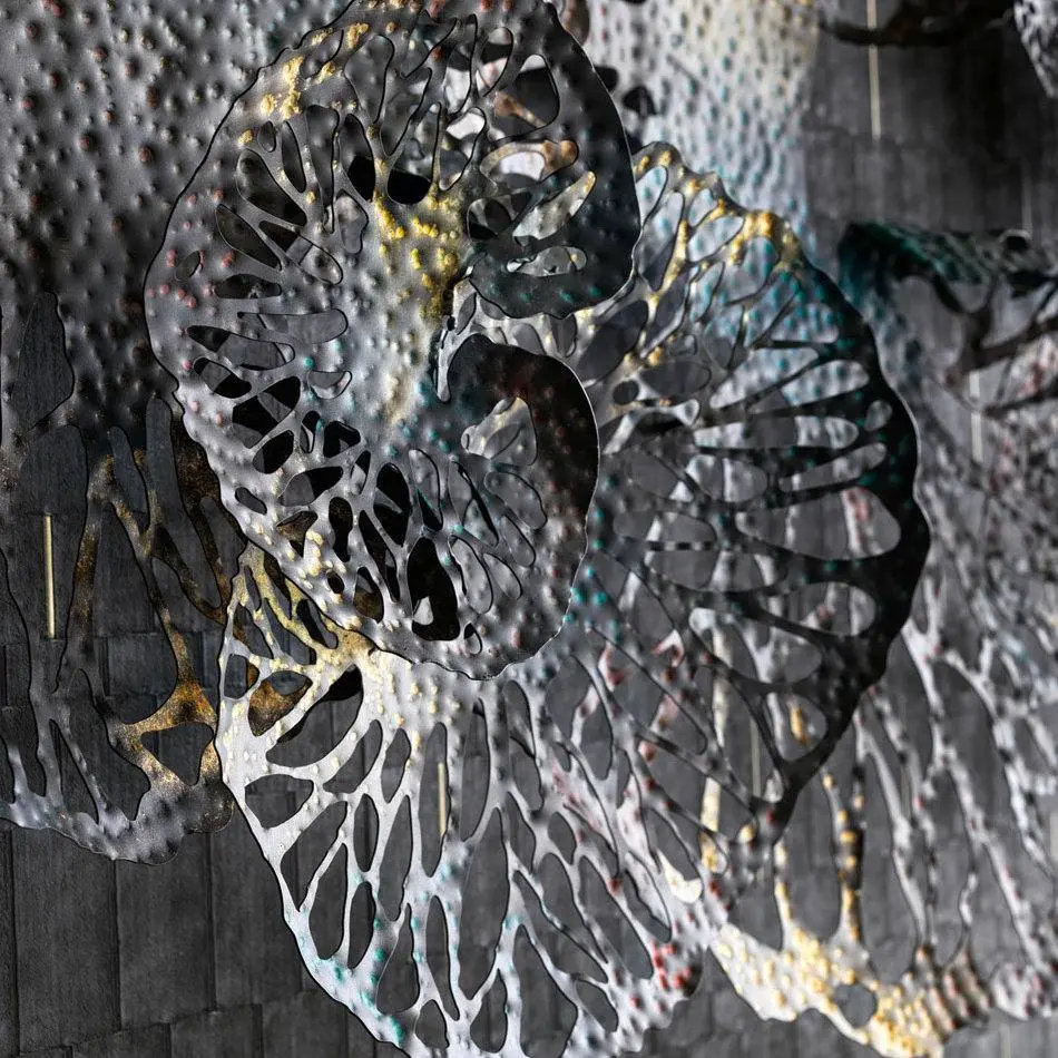 Сложная ажурная структура ловит свет, заставляя металл мерцать приглушёнными оттенками серебра, стали и антрацита, создавая игру теней, словно солнечные лучи пробиваются сквозь толщу воды. Каждая грань этого произведения обрабатывалась вручную, подчёркивая филигранность замысла и превращая металл в живую ткань. Контуры, лишённые жёсткости, плавно переплетаются, будто продолжая друг друга, создавая единую пульсирующую композицию. В этом нет случайности — здесь продумана каждая линия, каждый изгиб, каждая едва уловимая тень.