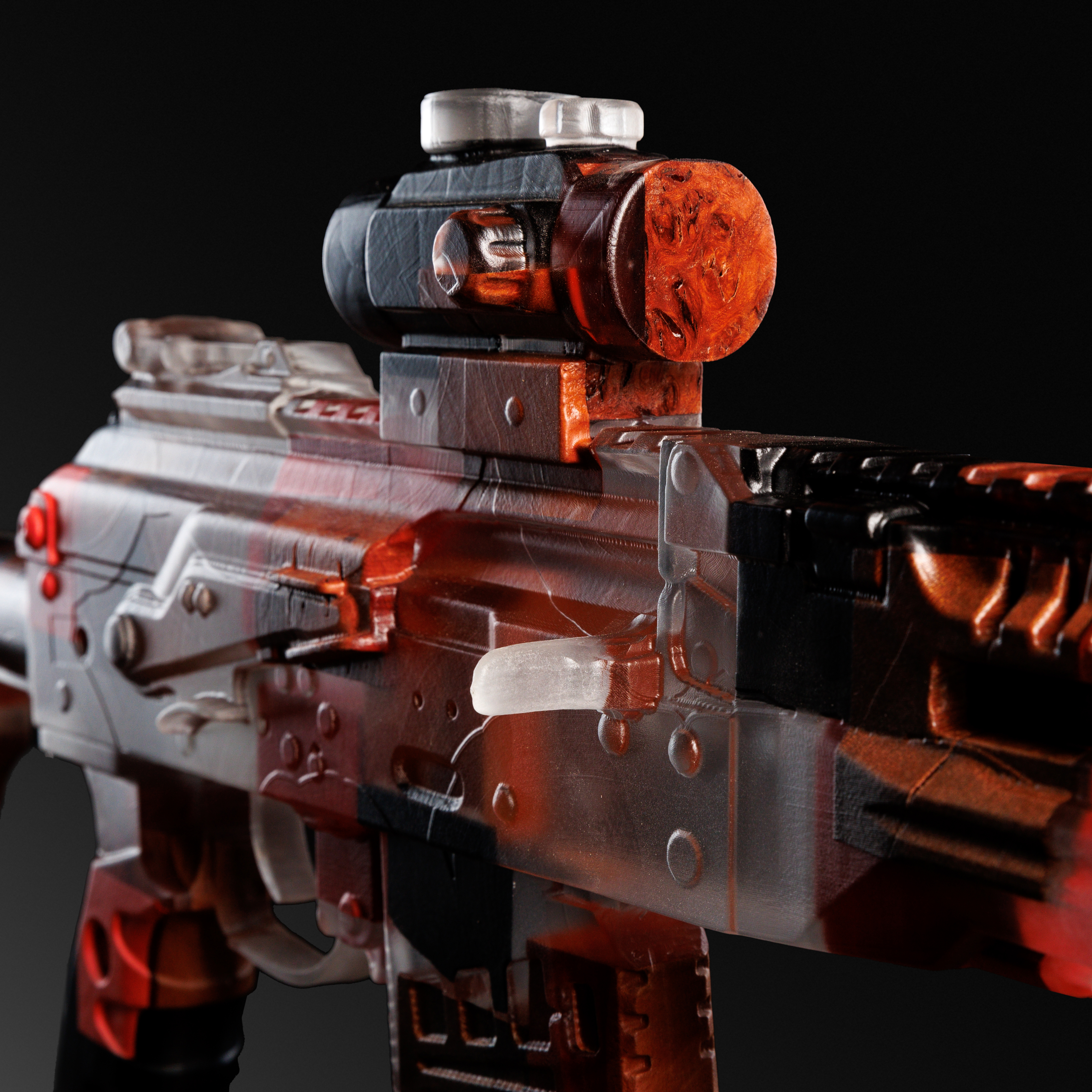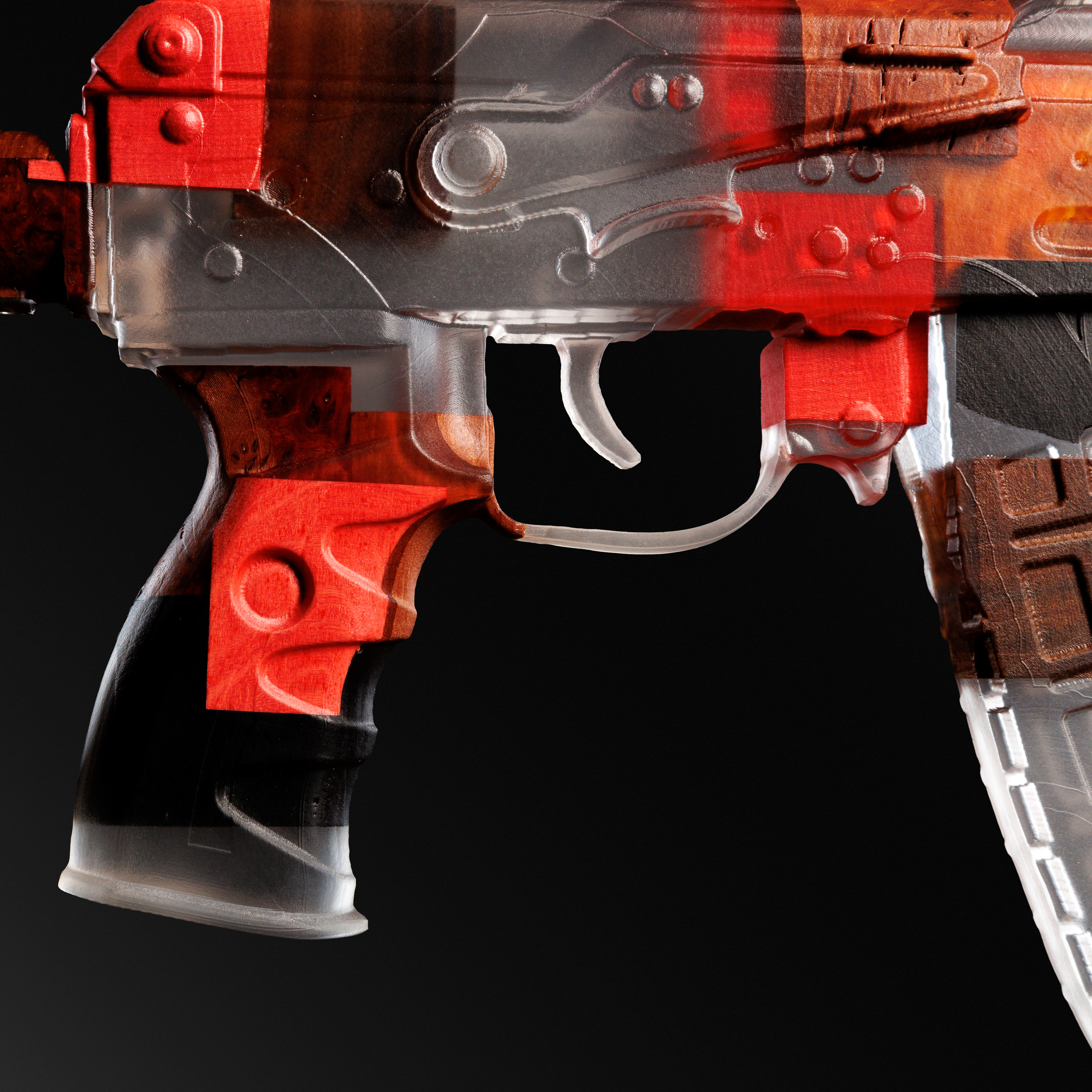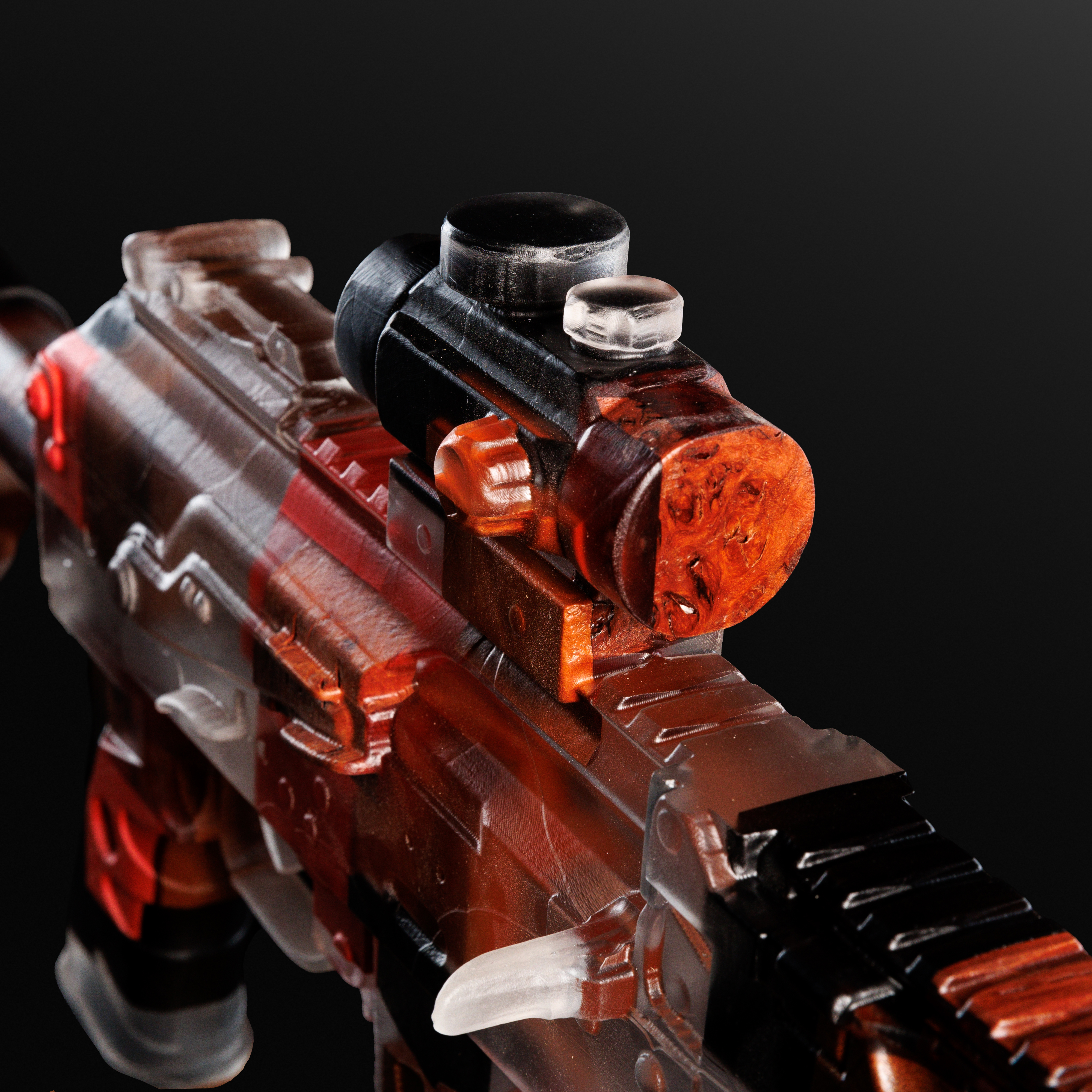 Работа впечатляет не только фактурой, но и архитектурной точностью: каждый элемент — от ложа до прицела, от магазина до дульного среза — выведен с ювелирной аккуратностью. Прозрачные участки создают эффект «рентгена», позволяя увидеть внутреннюю геометрию формы, в то время как насыщенные красные, чёрные и древесные вкрапления усиливают драматизм образа. Этот предмет не имитирует оружие — он осмысляет его, превращая в арт-инсталляцию, в которой органика дерева вступает в диалог с технологичностью и символизмом.