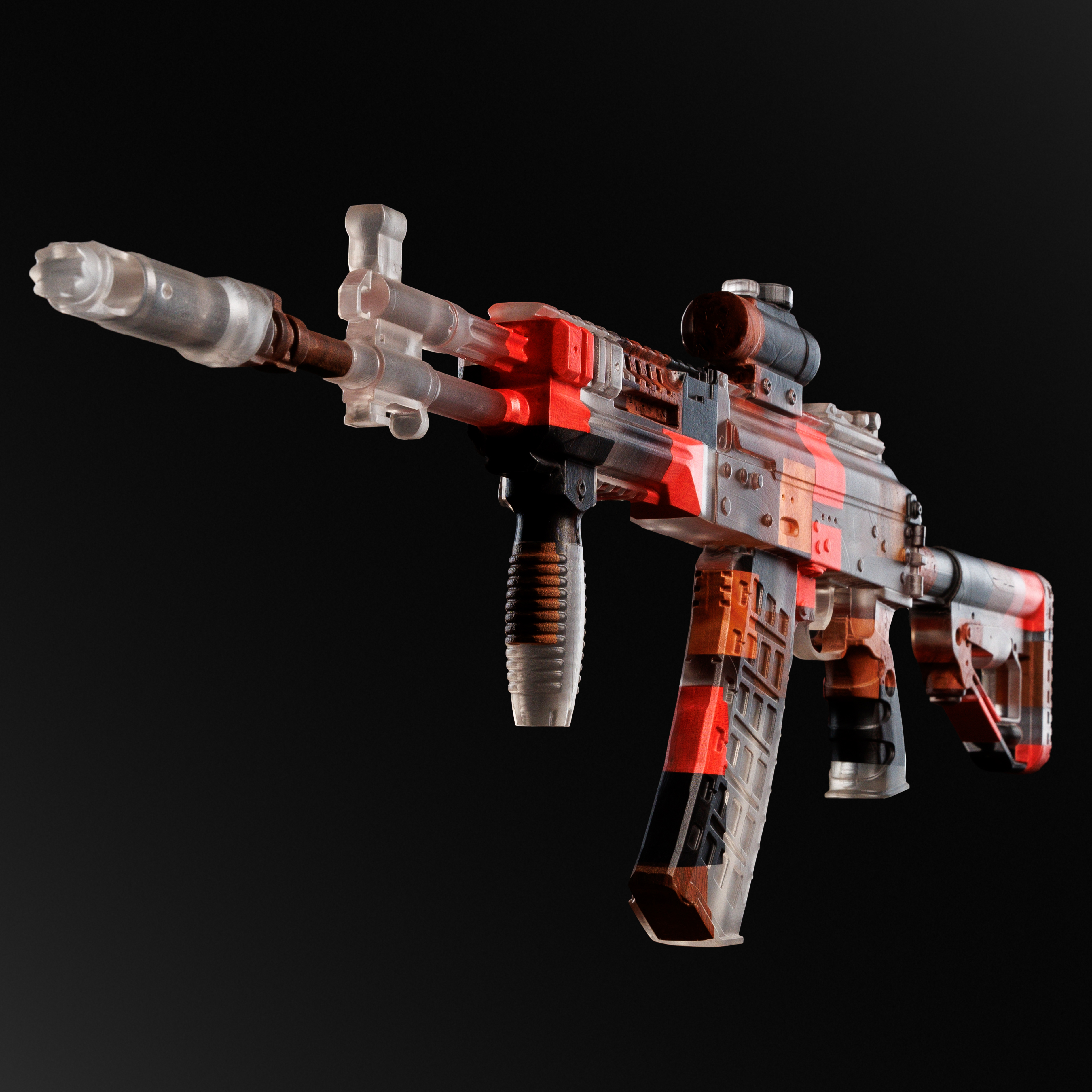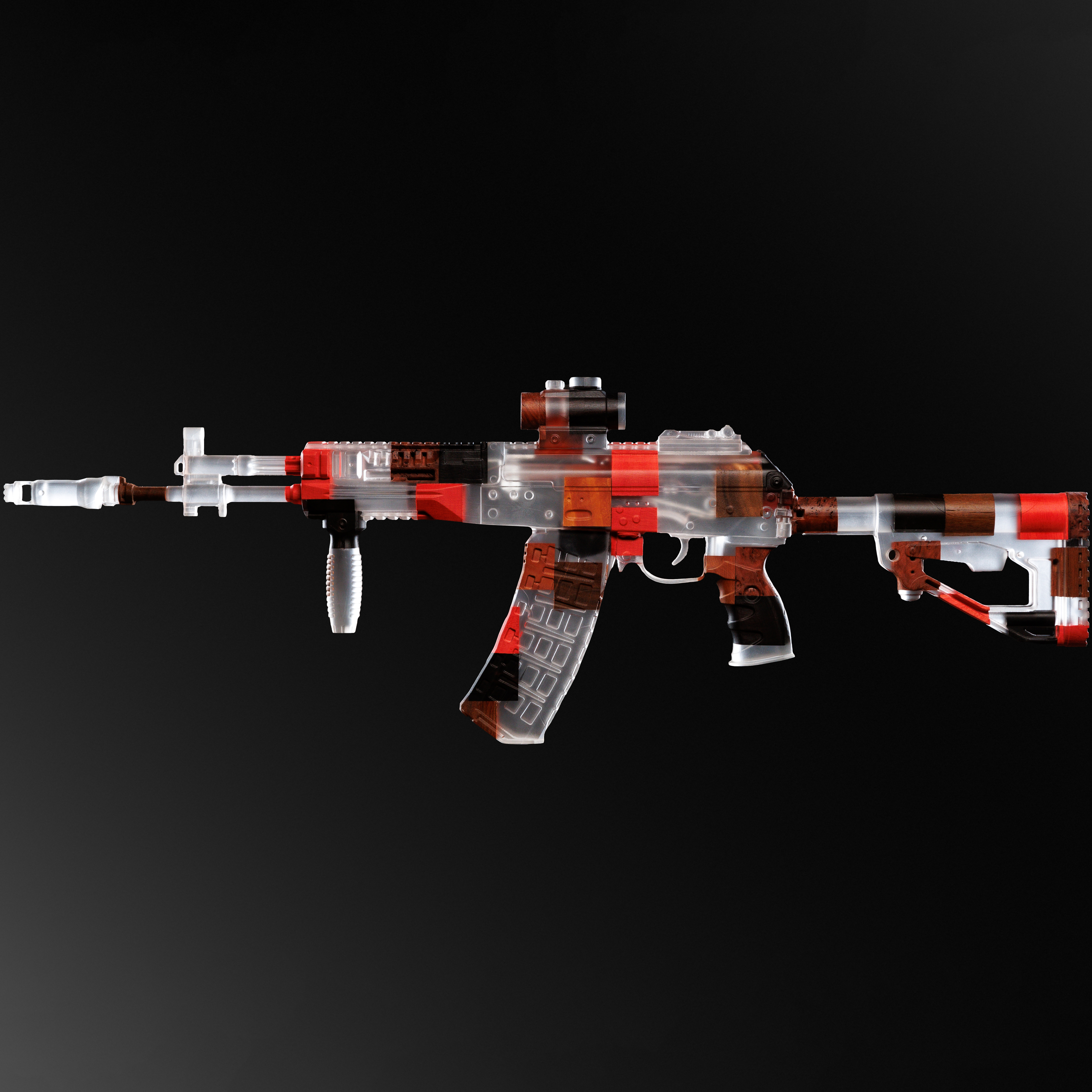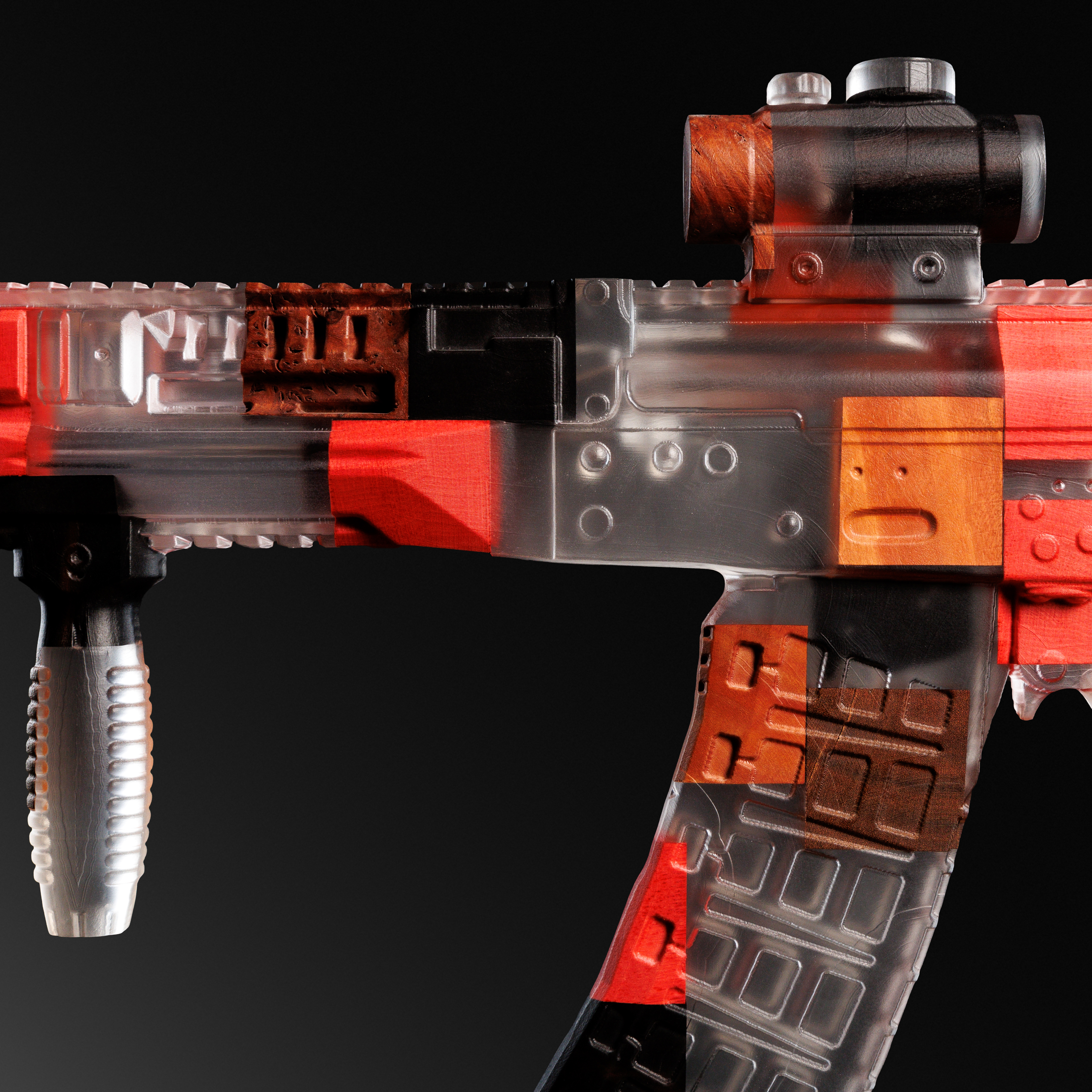 Работа впечатляет не только фактурой, но и архитектурной точностью: каждый элемент — от ложа до прицела, от магазина до дульного среза — выведен с ювелирной аккуратностью. Прозрачные участки создают эффект «рентгена», позволяя увидеть внутреннюю геометрию формы, в то время как насыщенные красные, чёрные и древесные вкрапления усиливают драматизм образа. Этот предмет не имитирует оружие — он осмысляет его, превращая в арт-инсталляцию, в которой органика дерева вступает в диалог с технологичностью и символизмом.