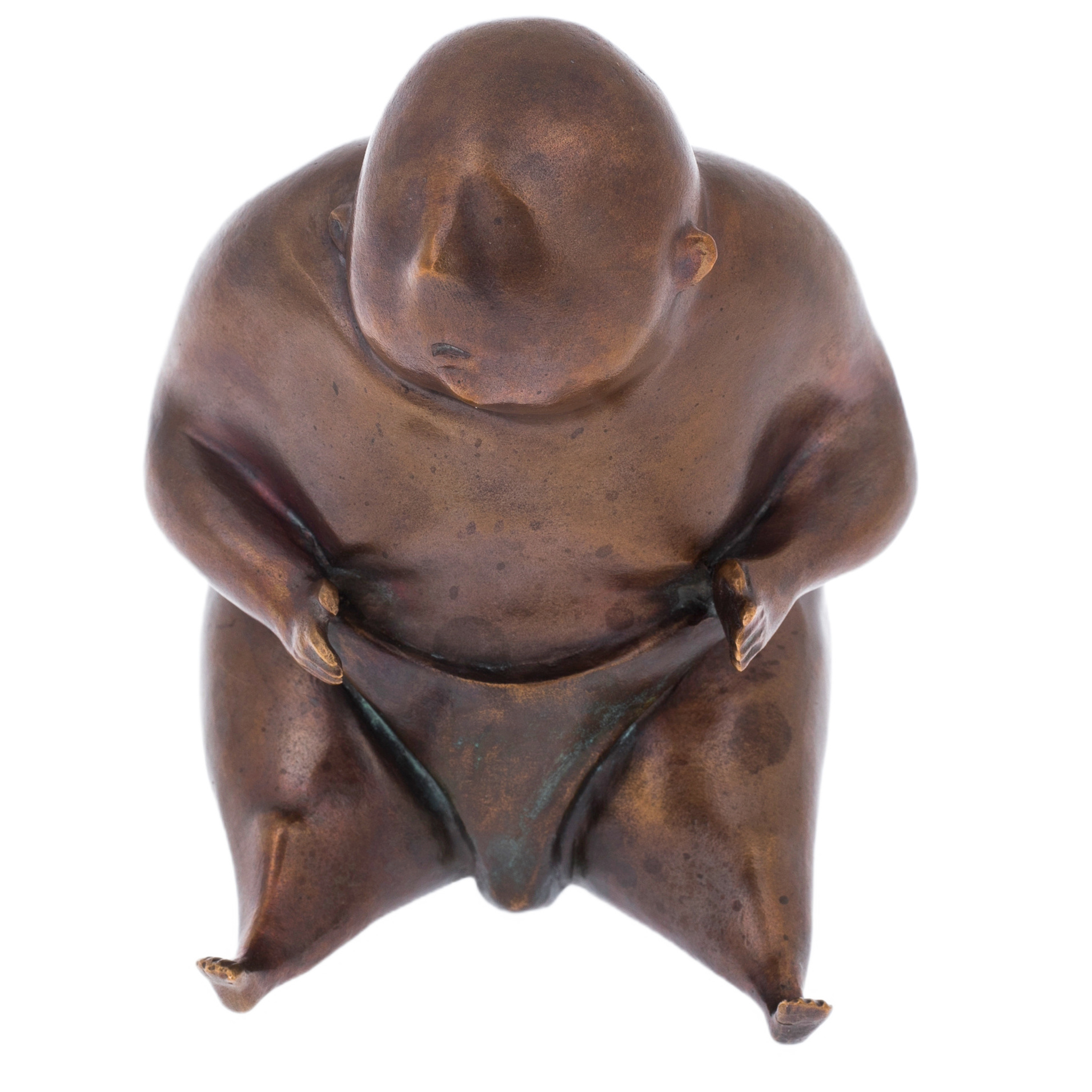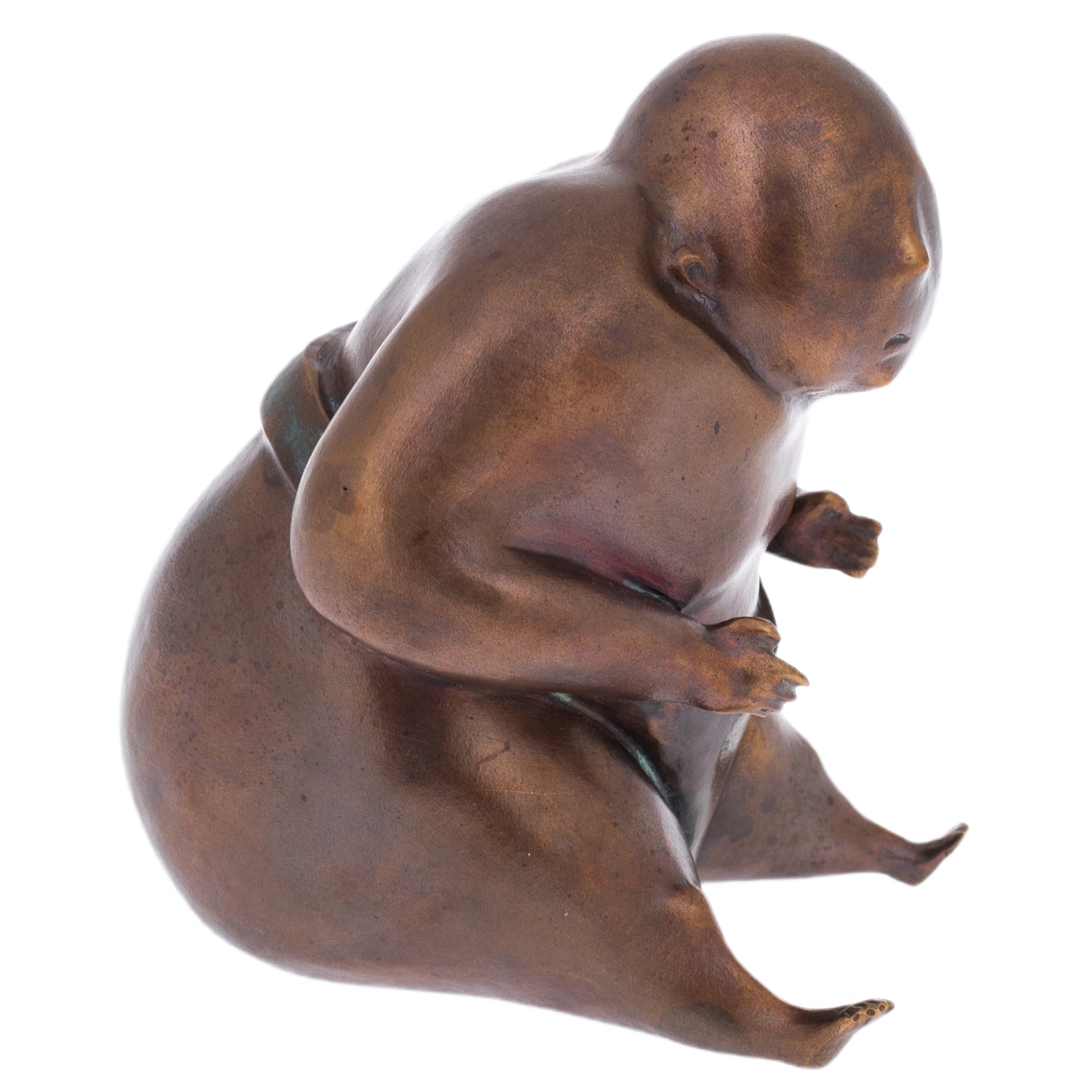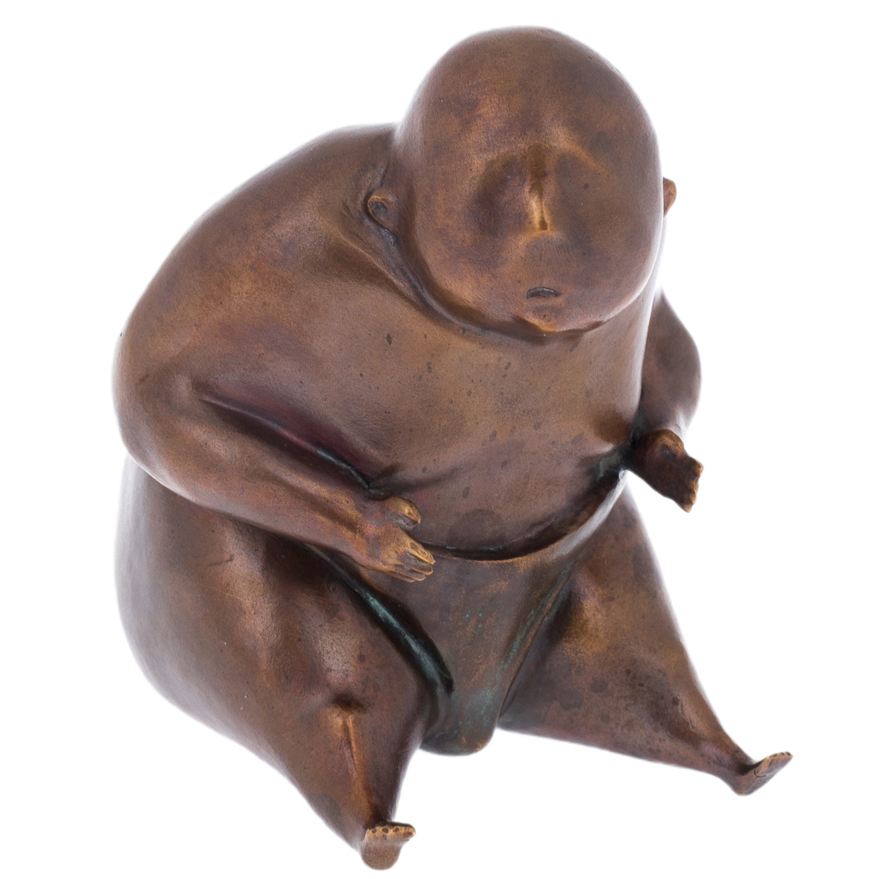 Авторская скульптура из бронзы "Обними меня" — художественное произведение, вбирающее в себя философию тела, жеста и молчаливой эмоции. Неуловимая грань между трогательностью и абсурдом, простотой и сакральной глубиной воплощена в округлой, почти лишённой черт фигуре, застигнутой в момент уязвимой просьбы. Поза передаёт стремление к близости и одновременно безмолвное признание собственной замкнутости. Бронзовая поверхность скульптуры патинирована тёплым коричнево-янтарным тоном с зелёными вкраплениями, придающими образу живую материальность и внутреннюю вибрацию. Пластика лаконична, но выразительна: отсутствием деталей подчёркнуты жесты, массы, внутренний ритм.