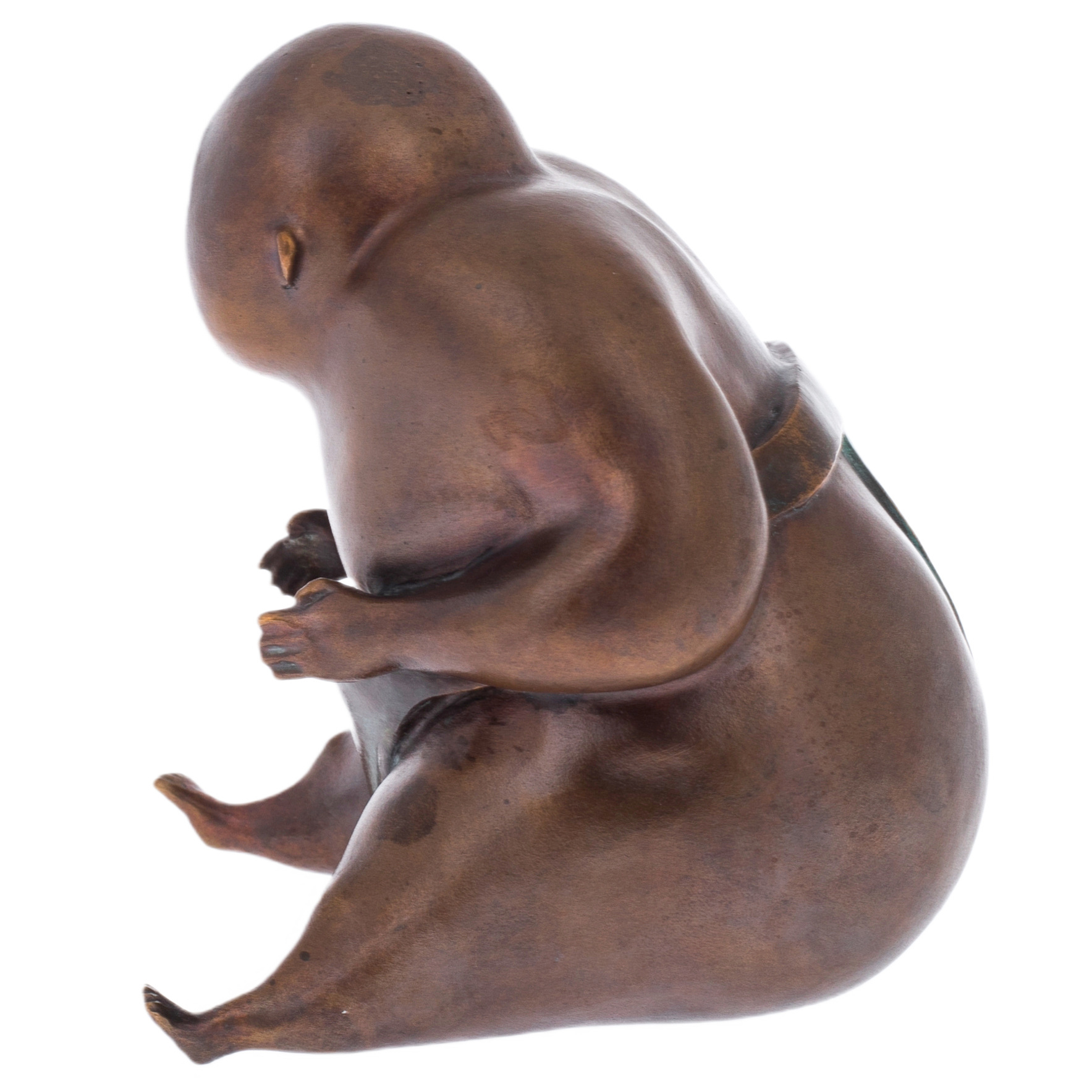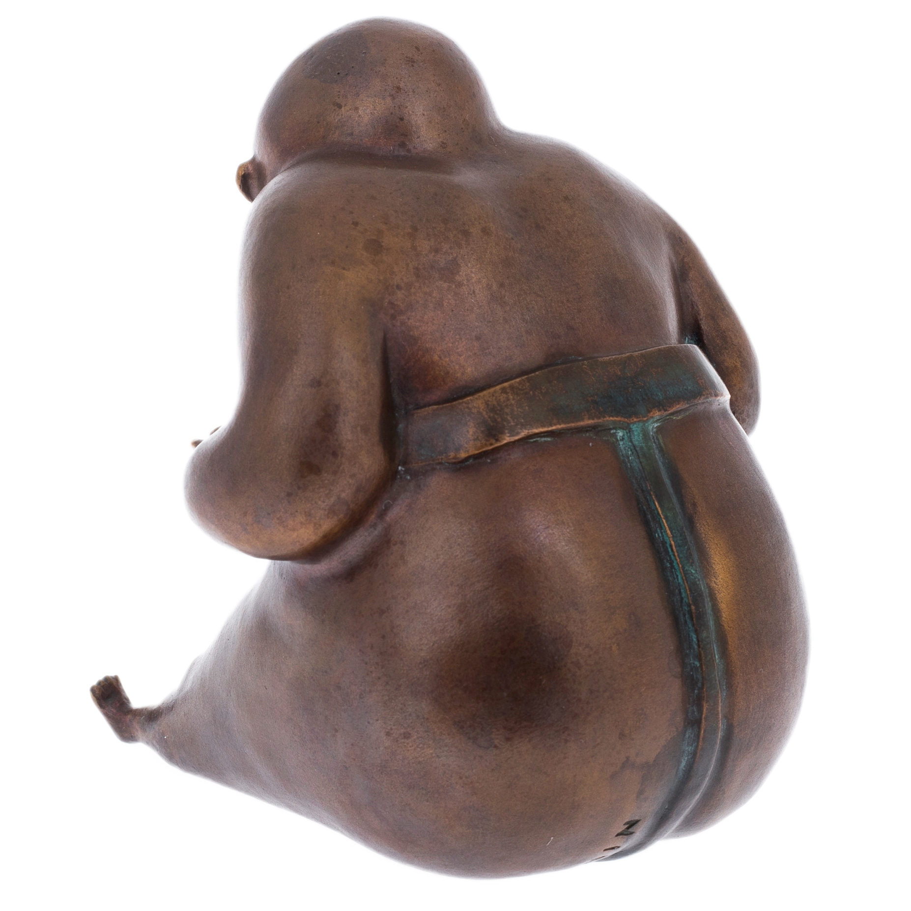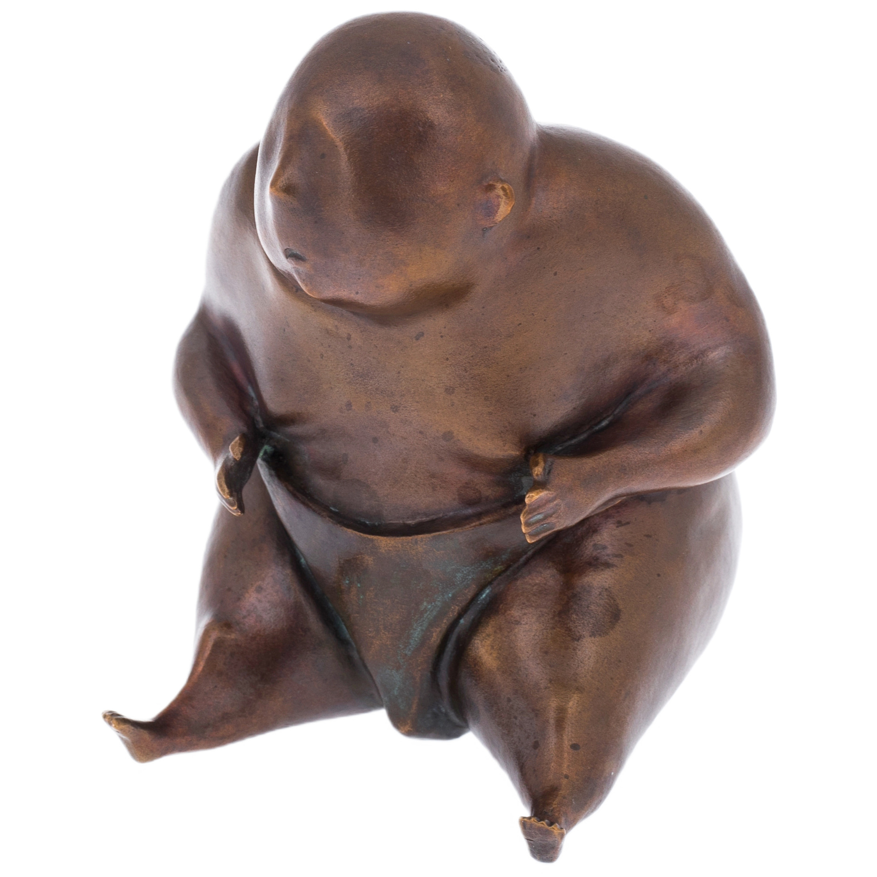 Авторская скульптура из бронзы "Обними меня" — художественное произведение, вбирающее в себя философию тела, жеста и молчаливой эмоции. Неуловимая грань между трогательностью и абсурдом, простотой и сакральной глубиной воплощена в округлой, почти лишённой черт фигуре, застигнутой в момент уязвимой просьбы. Поза передаёт стремление к близости и одновременно безмолвное признание собственной замкнутости. Бронзовая поверхность скульптуры патинирована тёплым коричнево-янтарным тоном с зелёными вкраплениями, придающими образу живую материальность и внутреннюю вибрацию. Пластика лаконична, но выразительна: отсутствием деталей подчёркнуты жесты, массы, внутренний ритм.