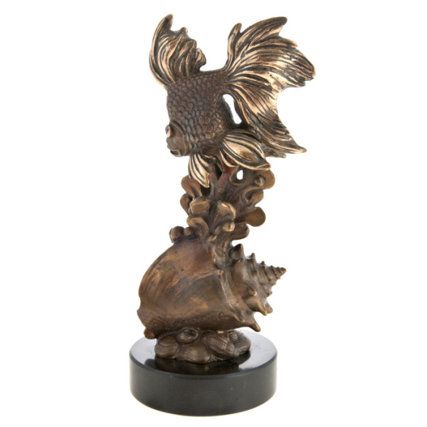 Работы «Золотая рыбка», «Охота на Золотую рыбку» и «Жемчужина» выполнены из бронзы с применением вакуумного лития с использованием жемчуга, аметистов и базальтовой подставки.