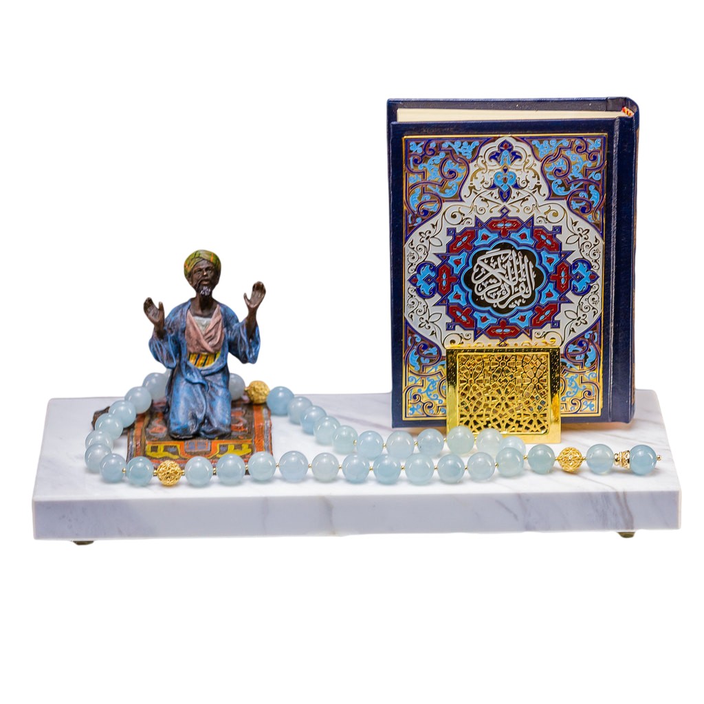 Размеры: подставка — 27х11 см, высота — 17 см, длина четок — 27 см, коран — 14х10х2 см.