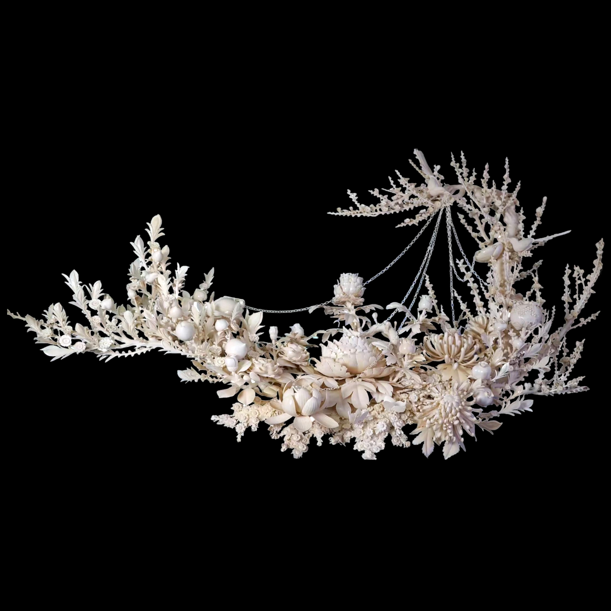 Кантонская техника резьбы проявляется здесь в предельной деликатности: лепестки цветов выполнены с почти ювелирной тонкостью, края их слегка изогнуты, создавая эффект живой ткани. Поверхности варьируются от гладких до фактурных, что придаёт композиции глубину и делает её особенно выразительной при изменении освещения. Многослойность построения позволяет рассматривать изделие с разных ракурсов, каждый раз открывая новые детали и связи между элементами.