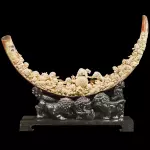 Композиция из бивня мамонта «Благоприятные львы играют с шаром» — изысканное произведение, выполненное из цельного бивня ледниковой эпохи, естественная дуга которого превращена в торжественную арку. По внутренней линии изгиба развёрнута сцена с группой львов-хранителей, символизирующих силу, защиту и благословение. В центре композиции — резной шар с геометрическим орнаментом, вокруг которого львы играют и соперничают, создавая динамичный и одновременно гармоничный ритм.