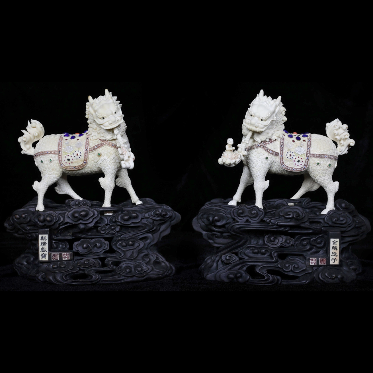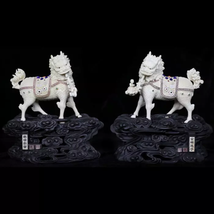 Каждый цилинь изображён в торжественной поступи, с приподнятой головой и внимательным, почти осмысленным взглядом. Декоративные попоны, покрывающие их спины, украшены тончайшей резьбой и инкрустациями, создающими эффект драгоценного убранства. В одном из образов читается мотив подношения — фигура держит символический дар, отсылающий к идее благословения, изобилия и продолжения рода. Парность композиции подчёркивает гармонию и баланс, отражая союз силы и мудрости, защиты и процветания.