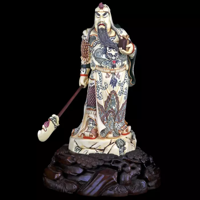 Композиция из бивня мамонта «Бог долголетия» раскрывает иной, более редкий и многослойный образ долголетия в китайской традиции — не только как спокойного течения времени, но как силы, защищающей жизнь и сохраняющей её устойчивость. Перед зрителем предстает фигура, сочетающая черты воинской решимости и духовной зрелости, что отсылает к идее активного долголетия — жизни, наполненной силой, контролем над обстоятельствами и внутренней дисциплиной.