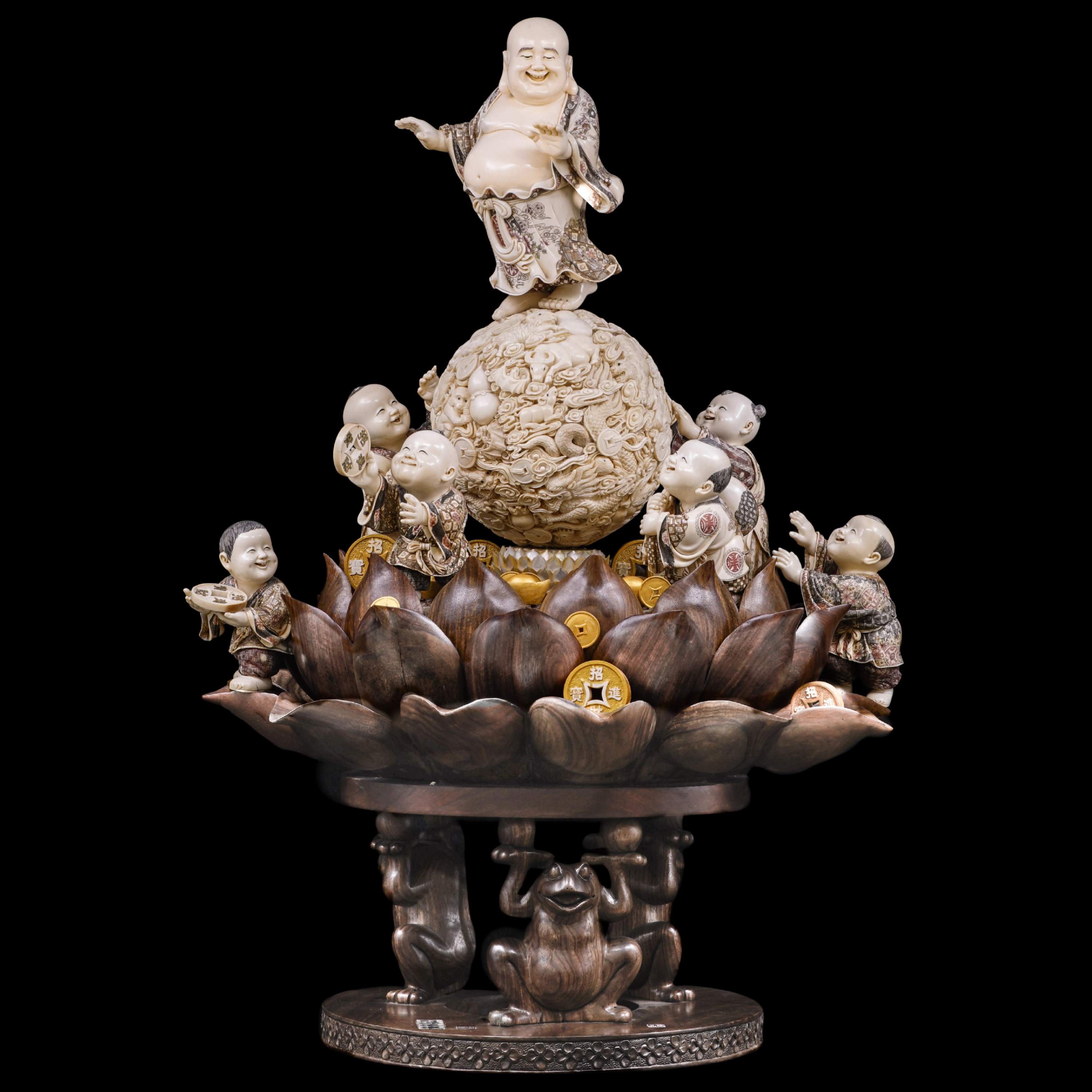 Вокруг основания расположены дети, играющие с золотыми монетами. Их оживлённые жесты и радостные лица создают ощущение непрерывного движения и веселья. В китайской символике дети выражают продолжение рода, жизненную энергию и счастье семьи. Монеты с квадратным отверстием — древний знак богатства и процветания, а их изобилие вокруг лотосового основания подчёркивает идею неиссякаемого достатка.