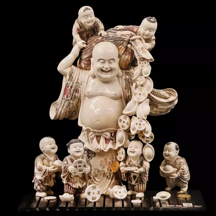 Композиция из бивня мамонта «Богатство льётся рекой» воплощает один из самых жизнерадостных и благопожелательных образов китайской традиции — фигуру смеющегося Будды, известного как Буддай или Хотэй. В восточной культуре этот персонаж символизирует изобилие, счастье и щедрость судьбы. Его образ связан с представлением о том, что истинное богатство приходит к тем, кто живёт в гармонии и радости.