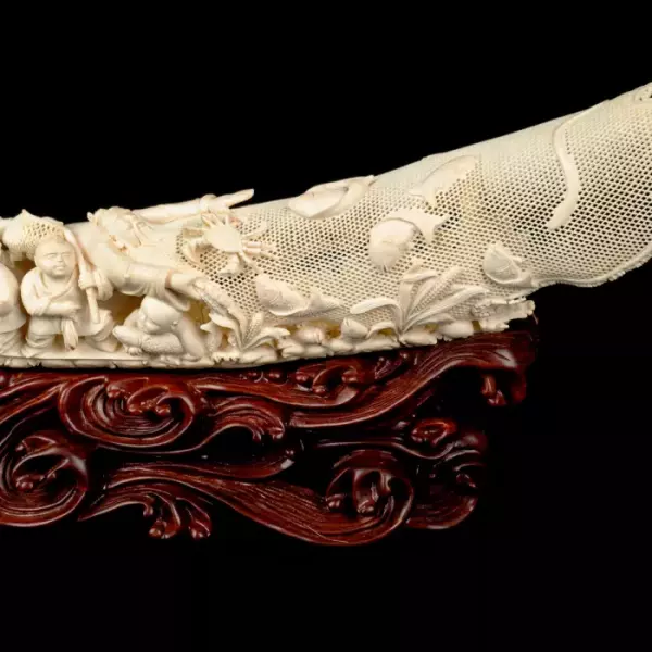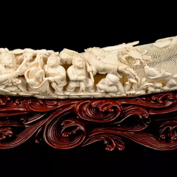 Композиция из бивня мамонта «Богатый улов» — выразительное произведение кантонской резьбы, в котором природная форма материала превращена в динамичную сюжетную сцену. Изогнутая линия бивня становится подобием лодки или речной волны, на которой разворачивается история удачной рыбалки. Фигуры детей, выполненные с живой пластикой и мягкой проработкой лиц, удерживают сети и крупную рыбу, создавая ощущение движения и радостного оживления.