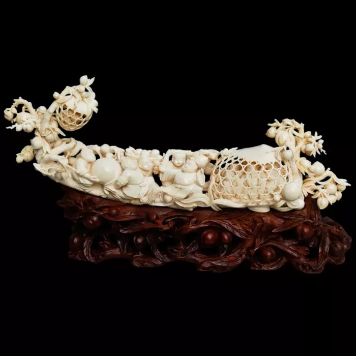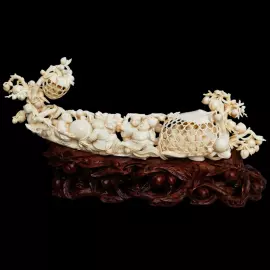 Композиция из бивня мамонта «Богатый улов» — изящное произведение кантонской резьбы, в котором природная форма материала превращена в живую сюжетную сцену. Изогнутая линия бивня становится основой композиции, на которой разворачивается динамичный эпизод, наполненный движением и эмоциями. Фигуры с выразительной пластикой лиц и мягко прорезанными складками одежды создают ощущение радостного оживления, а тщательно проработанные рыбы и декоративные элементы усиливают ощущение изобилия.