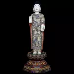 Композиция из бивня мамонта «Будда Чандана-Пунья» представляет собой утончённое произведение восточной скульптурной традиции, воплощающее образ Будды в состоянии спокойного благословения и духовного наставления. Скульптура выполнена из мамонтовой кости и установлена на многоярусном пьедестале в форме раскрытого лотоса, украшенного насыщенной росписью и декоративными орнаментами.