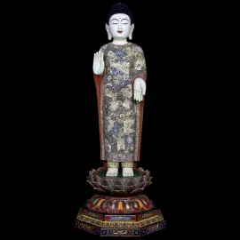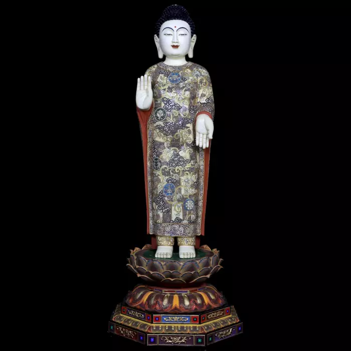 Фигура Будды изображена стоящей в величественной и спокойной позе. Лицо отличается мягким выражением внутреннего равновесия и мудрости. Полузакрытые глаза передают состояние глубокого созерцания, а едва заметная улыбка создаёт ощущение благожелательности и духовной ясности. Правая рука поднята в жесте благословения и защиты, тогда как левая раскрыта ладонью вперёд, символизируя щедрость, милость и готовность даровать духовное руководство.