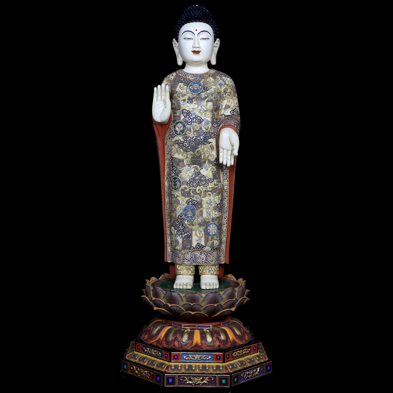 Фигура установлена на лотосовом пьедестале — традиционном символе духовной чистоты и просветления. Лепестки лотоса окрашены в глубокие красные, зелёные и золотые оттенки, создавая выразительный контраст со светлой поверхностью мамонтовой кости. Многоярусное основание, украшенное геометрическими и цветочными элементами, придаёт композиции торжественность и архитектурную завершённость.
