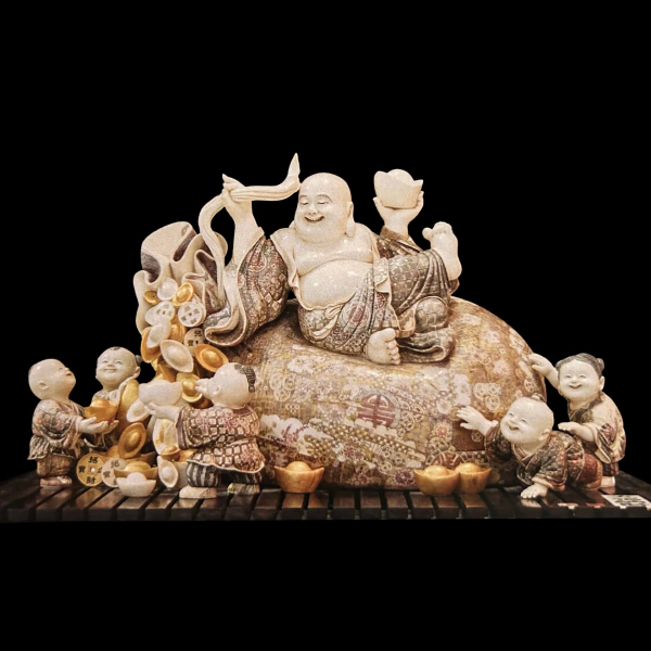 Композиция из бивня мамонта «Будда с пятью детьми благословляет на богатство» воплощает один из самых благопожелательных сюжетов китайского декоративного искусства, соединяющий образы изобилия, счастья и семейного благополучия. В центре композиции расположен смеющийся Будда, известный как символ радости, щедрости и безмятежности. Его спокойная улыбка и расслабленная поза выражают состояние внутреннего равновесия и уверенности в благосклонности судьбы.