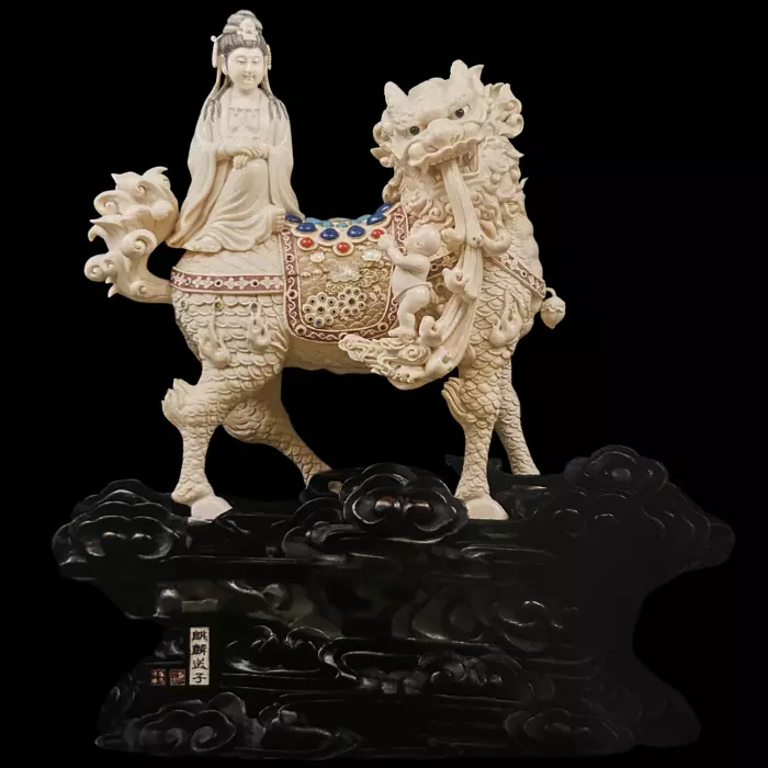 Богатая пластика композиции подчёркнута сложным орнаментом на попоне Цилиня, украшенной цветными вставками и изящными узорами. Контраст светлой резьбы из бивня мамонта и тёмного основания создаёт ощущение торжественности и древней мифологической сцены, словно возникшей из легенд Поднебесной.