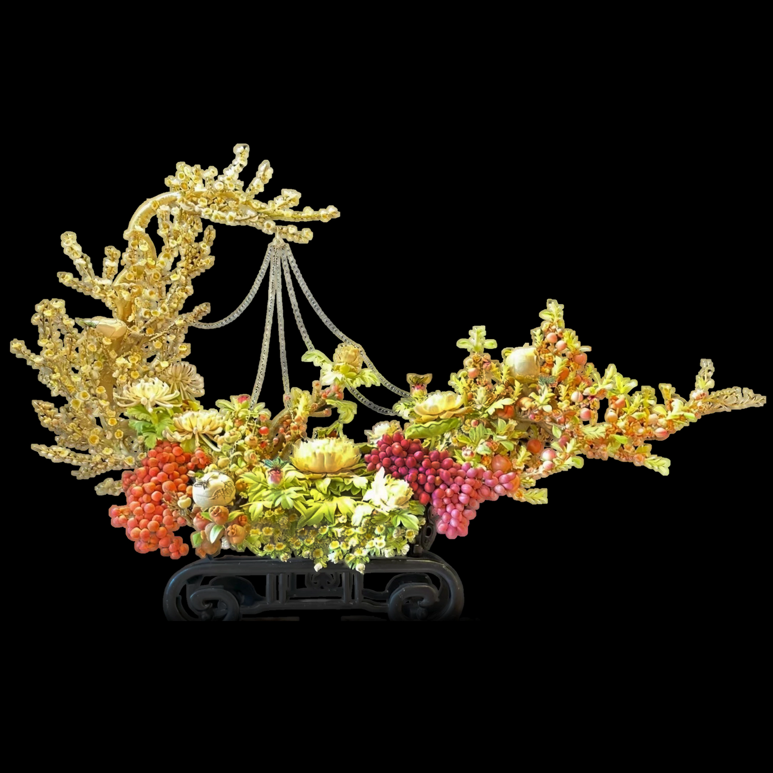 Техника кантонской резьбы проявляется здесь в максимальной сложности: мастер работает с глубокой прорезкой, многослойной композицией и филигранной детализацией мельчайших элементов. Каждый лепесток, каждая ягода и лист проработаны с ювелирной точностью, а использование природной окраски бивня усиливает реалистичность и декоративность одновременно. Контраст с тёмным резным основанием подчёркивает светящуюся лёгкость основной композиции, создавая эффект парящего сада.